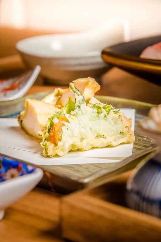 两份一品料理,穿插在六贯寿司里上桌。盐烤鳗鱼,鳗鱼裹上一层香脆外衣,内里鱼肉白嫩纤细,伴随着微妙的焦香;天妇罗拼盘,鲍鱼经过油锅洗礼,肉质依然嫩滑Q弹,炸至喷香的紫苏叶包裹着厚厚一层海胆,清新的香气更是衬托出鲜甜!