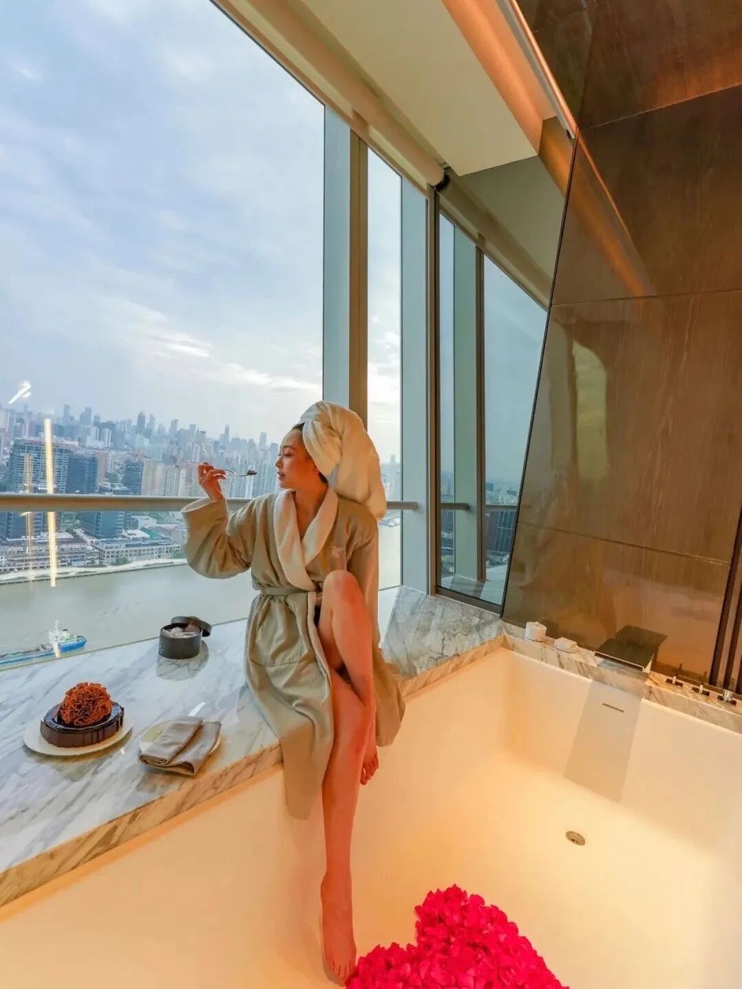 这间房型的优势还在于露天泡池,这是魔都唯一拥有浴缸和露天泡池的酒店客房!边泡澡,边放空当下真是好时光。