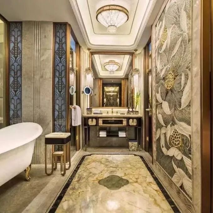 以Art Deco为主要设计风格的万达瑞华酒店,房间装饰就像菲茨杰拉德在《了不起的盖茨比》中描绘的那样流光溢彩,也毫不掩饰万达对于奢华逸境的精益求精。元宝形的浴缸自带优雅和高级的属性。