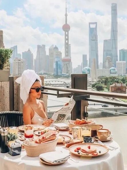 宝丽嘉酒店的180度的江景露台太迷人了,一面看魔都地标景观,一面看温柔的苏州河。露台面积非常宽敞,来一次露台早餐,腔调不要太好!