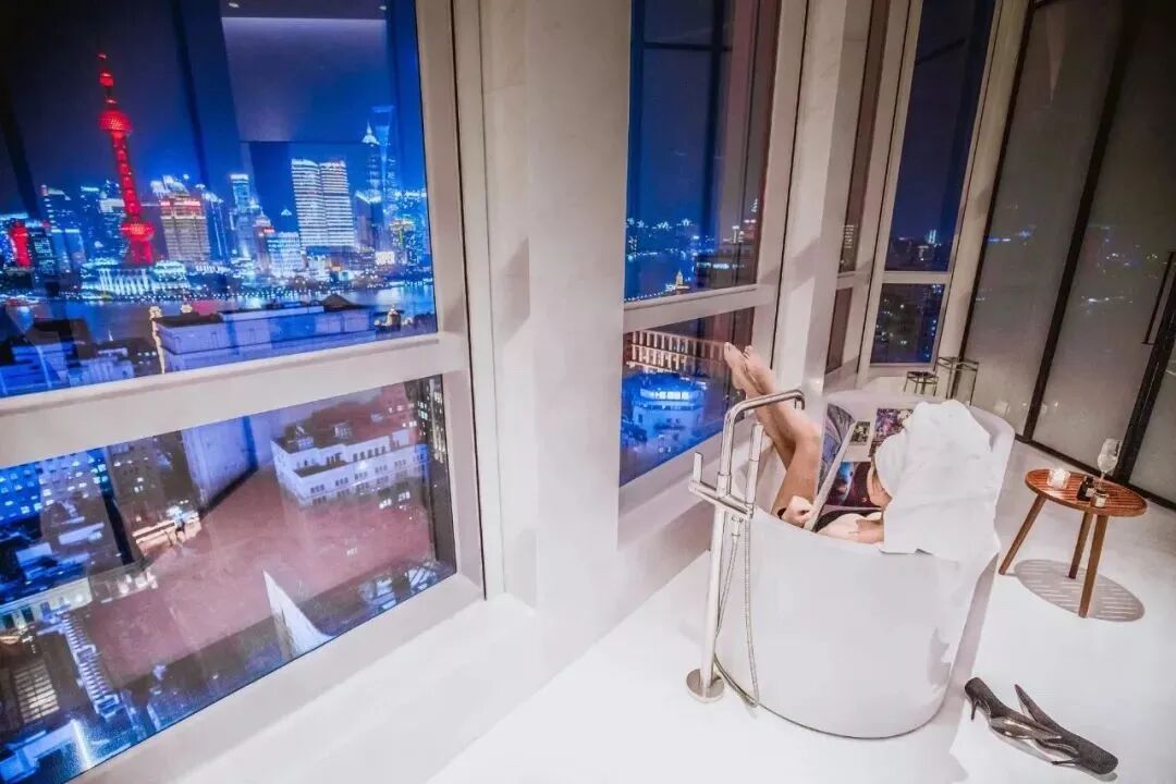 酒店的每间房都有浴缸。套房浴缸更是可将魔都的璀璨夜景一览无余,我们入住的全景套房的浴缸尤为迷人,浴缸位于一整面玻璃窗前,遥望魔都地标,每时每刻都能呈现不同的光影。
