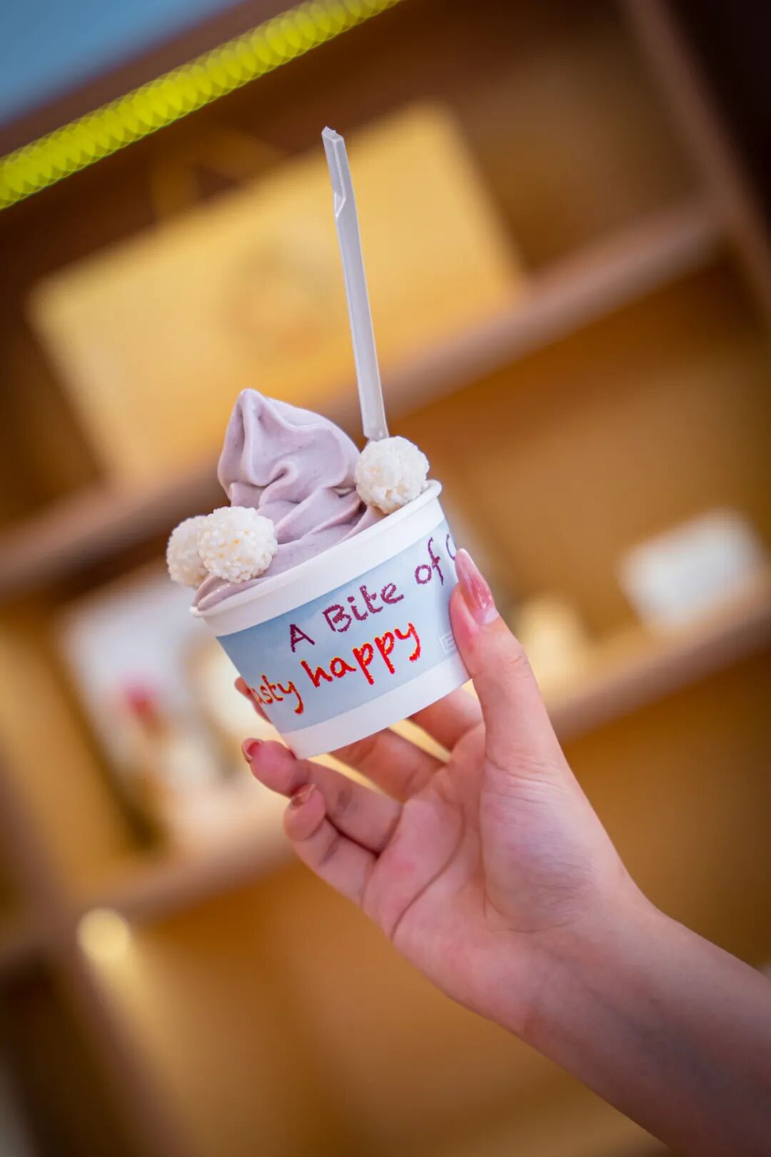 店内是个金黄色充满未来感的打卡空间,大厅中央还悬挂着一只会旋转的超大RYAN镜面球,随手拍拍就能凑满九宫格!