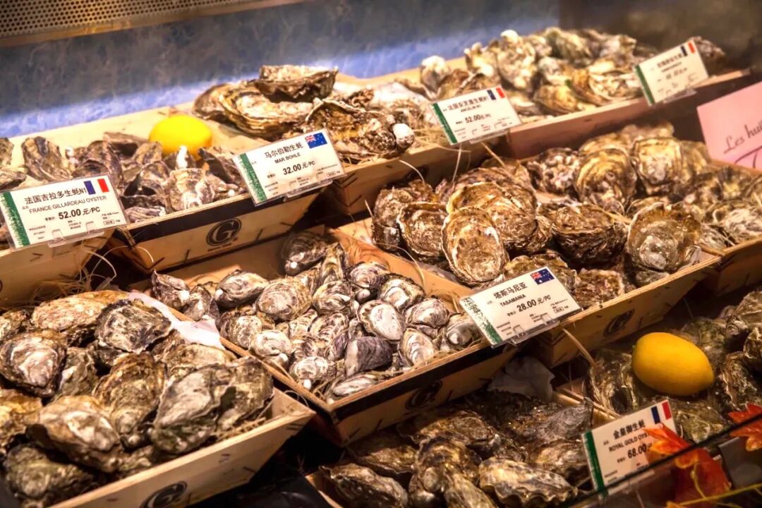 生蚝柜台一直是生鲜区的明星柜台,目前以日本、法国品种为主,兵库坂越、坂越,以及吉娜朵、月亮生蚝等等,只只饱满肉肥。付款后,工作人员会为你开蚝剃肉并用冰盘呈上,只需挤点柠檬汁,蚝肉随着海水滑入口中,要的就是这份鲜美满足!
