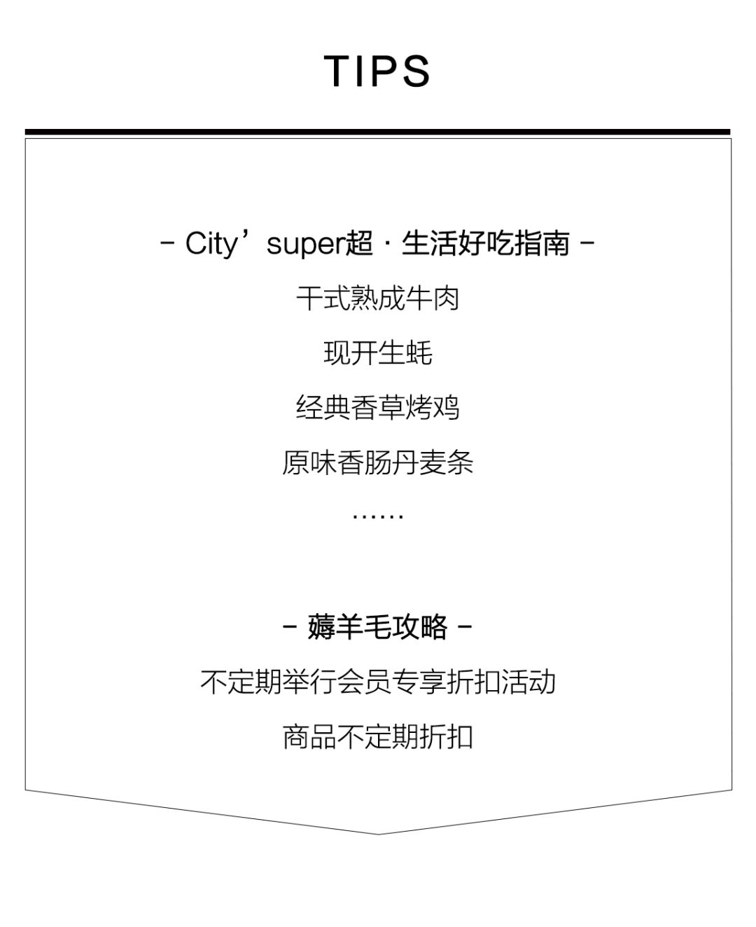 接连入驻高端商场的City’super,是魔都高端超市的代表,也是精致大女主钟爱的超市之一,因为在这里能淘到来自全世界的物产好物。每一间City’super的面积都非常大,分类清晰明了,生鲜区更是进去了就忍不住剁手。