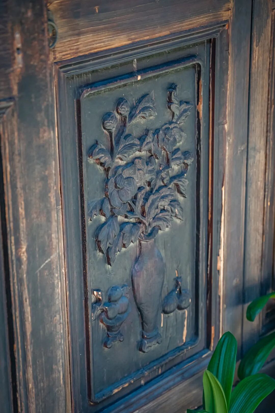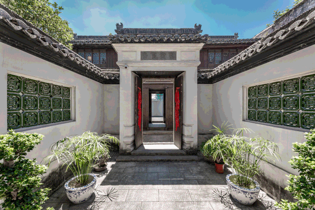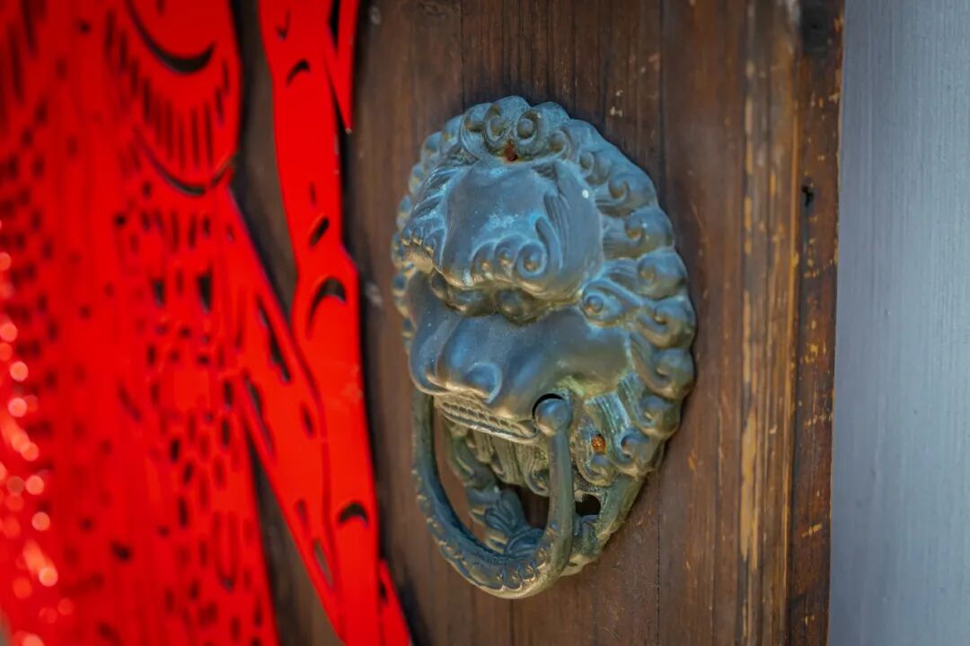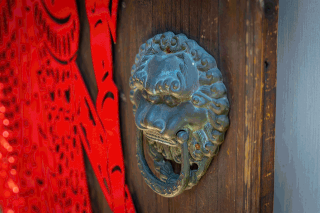 推开雕花楼的大门,首先进入的是“一进前楼”。大红色剪纸门联、怒目燃眉的辅首衔环,仿佛进入这里就能开启一段百年人文艺术之旅!