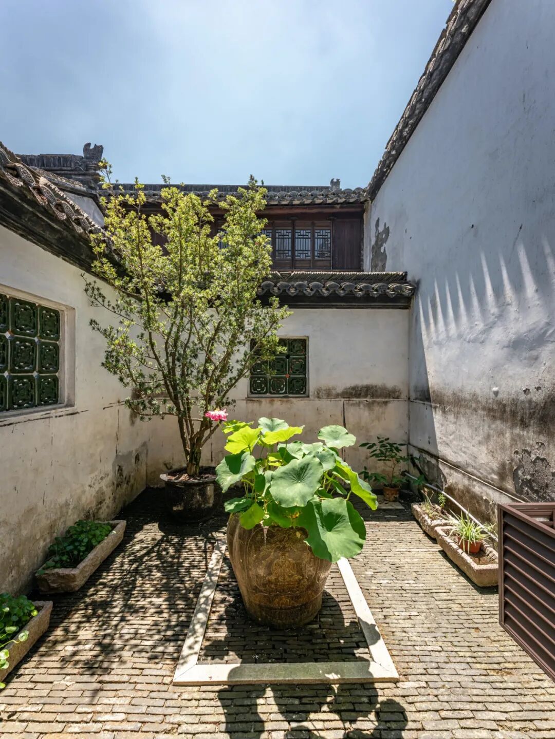屋外的天井也别有一番雅趣:青色地砖排列地整齐整齐,窄缝里衍生着绿莹莹的苔藓,荷花、草木点缀其间,一片生机勃勃!在那个年代,这种宅子应该就相当于现在的滨江大豪宅了吧!