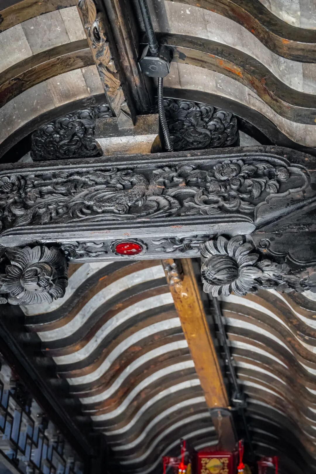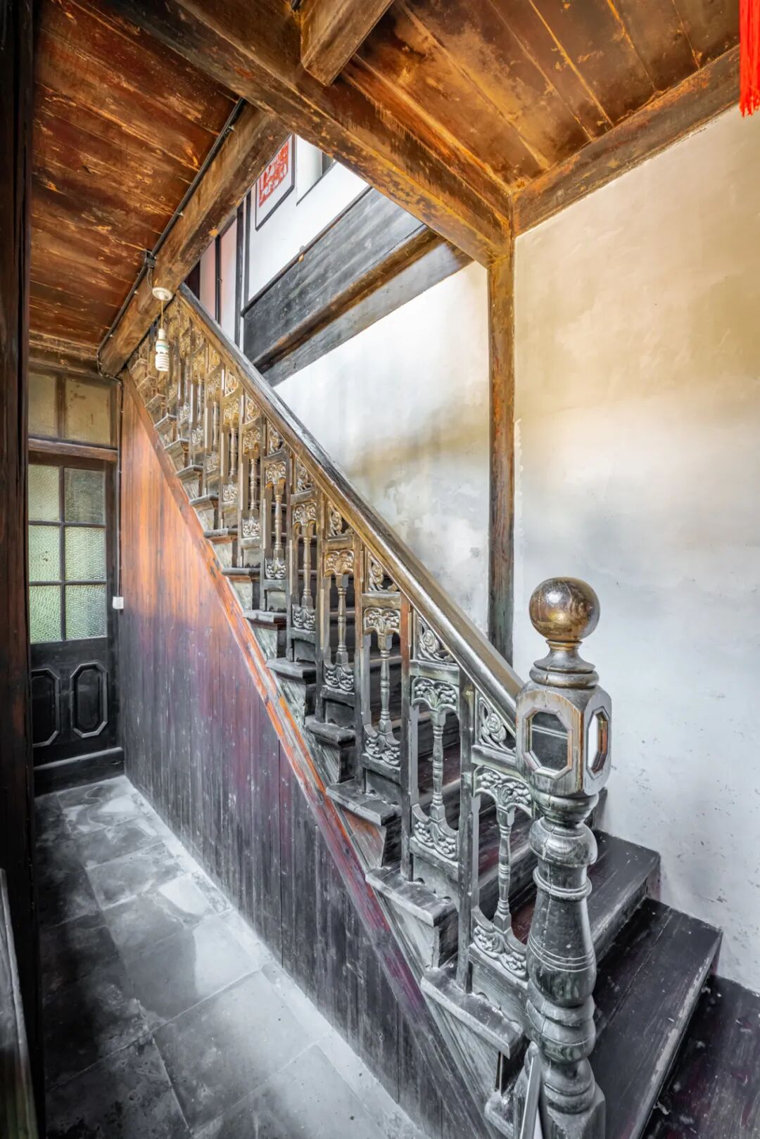 腰檐枋木上雕有穿枝二龙戏珠图案,其他门窗隔扇、楼梯扶手上也都是细节满满的中西式雕花,就连栏杆、挂落、雀替、斗拱等装饰小构件上也有精美的云纹、鸟兽浮雕,是上海非常少见的古代精品雕刻建筑。