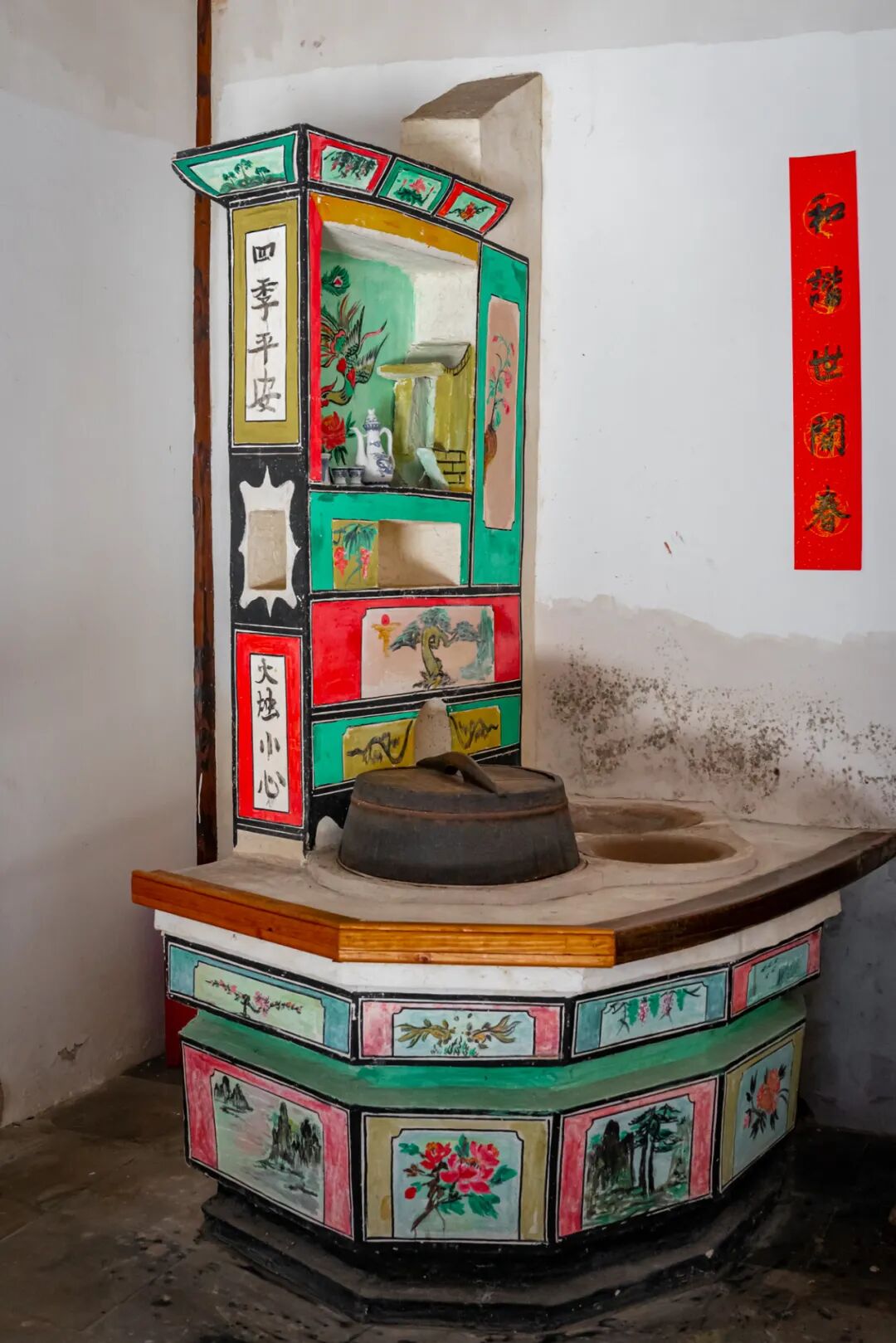 一走进厨房间,一眼便看到这个古风满满的灶台:灶壁上用水彩、水粉颜料绘制了各种吉祥图案和文字纹样,这种时尚灶壁画,就算在现在的农村也很少见了吧!房梁上还悬挂着竹篮、竹篮,眼前仿佛呈现出一幅炊烟袅袅的生活画像!