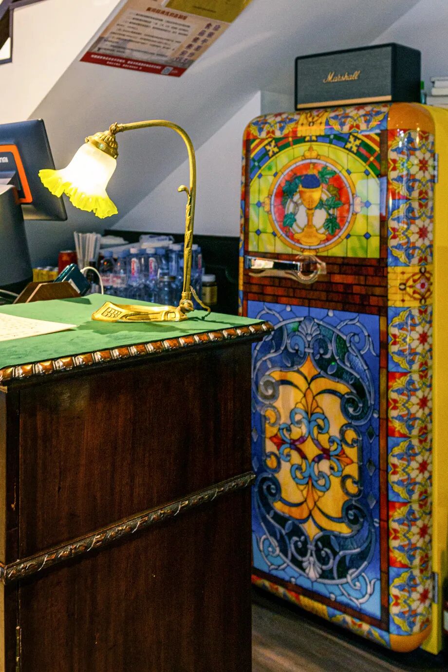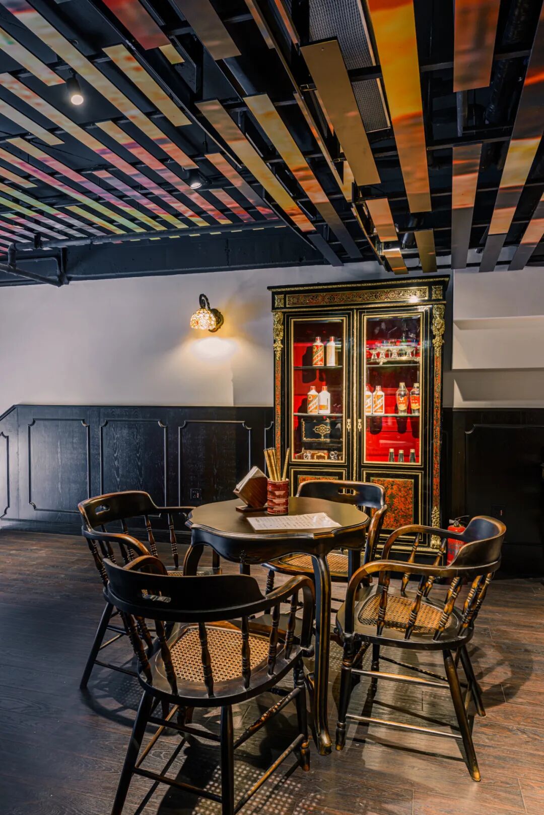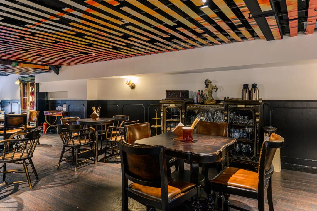 两层楼的空间,洋洋洒洒近20张桌子,尤以楼上安逸。若举办小型宴席的话还可用琉璃屏风遮挡。店里的物件皆是老板的私藏,黑胡桃木藤椅、西式古典酒柜、造型各异的壁灯,就连栏杆都有着近百年历史,活脱脱穿越回百年前老底子厢房的感觉。