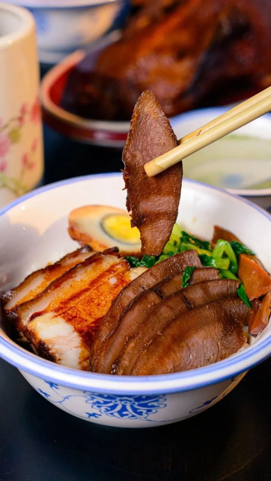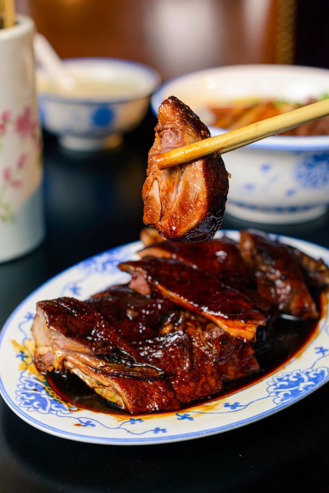 被酱汁包裹的鸭子,看起来红透透油亮亮。一口咬下,酱汁甜咸适宜,鸭子肉嫩,细细咀嚼,唇齿间的香味悠远绵长,很想当场再打包一只回家。