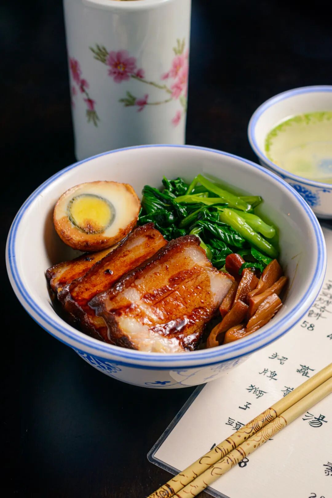 配汤也精巧,细碎的芹菜粒和萝卜丁都是经过抽筋处理的,完全不会有丝丝拉拉的感觉。混着金蒜成就了一碗清爽的配汤,十分解腻。