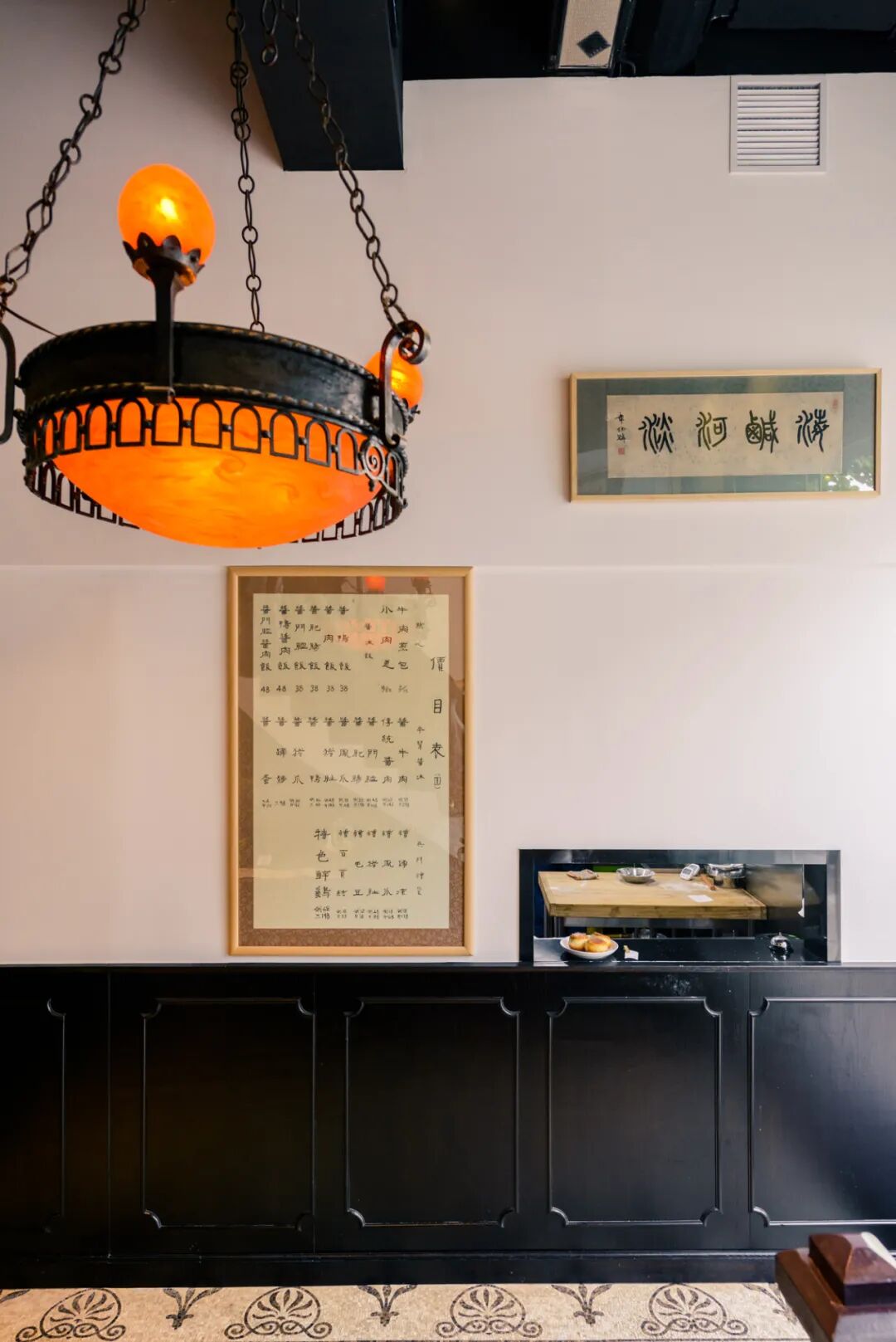 老板傅先生,是沪上百年梅龙镇酒家的传人,所以餐厅也是一派儒雅气质:标致的手写菜单装裱上墙、全透明的厨房间通透明亮,仅留有一处档口传递热菜,简洁又干净。