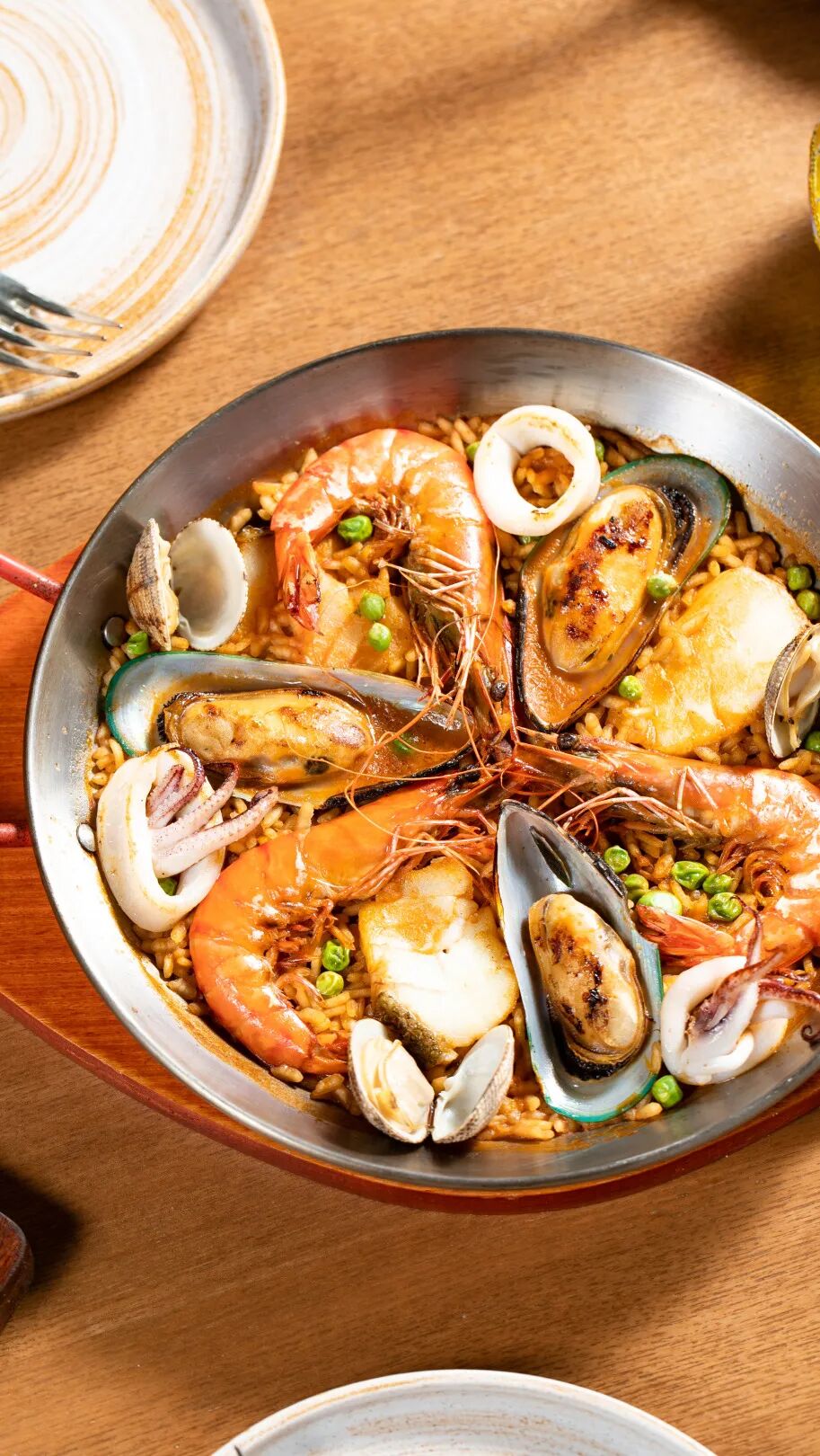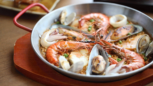 压轴的主食,是西班牙“国粹”——海鲜饭。大虾、鱼块、鱿鱼、贻贝,给足海鲜的丰满鲜味,藏红花带来诱人色泽,琳琅满目的食材和香料,一登场便成功吸引了你的目光。