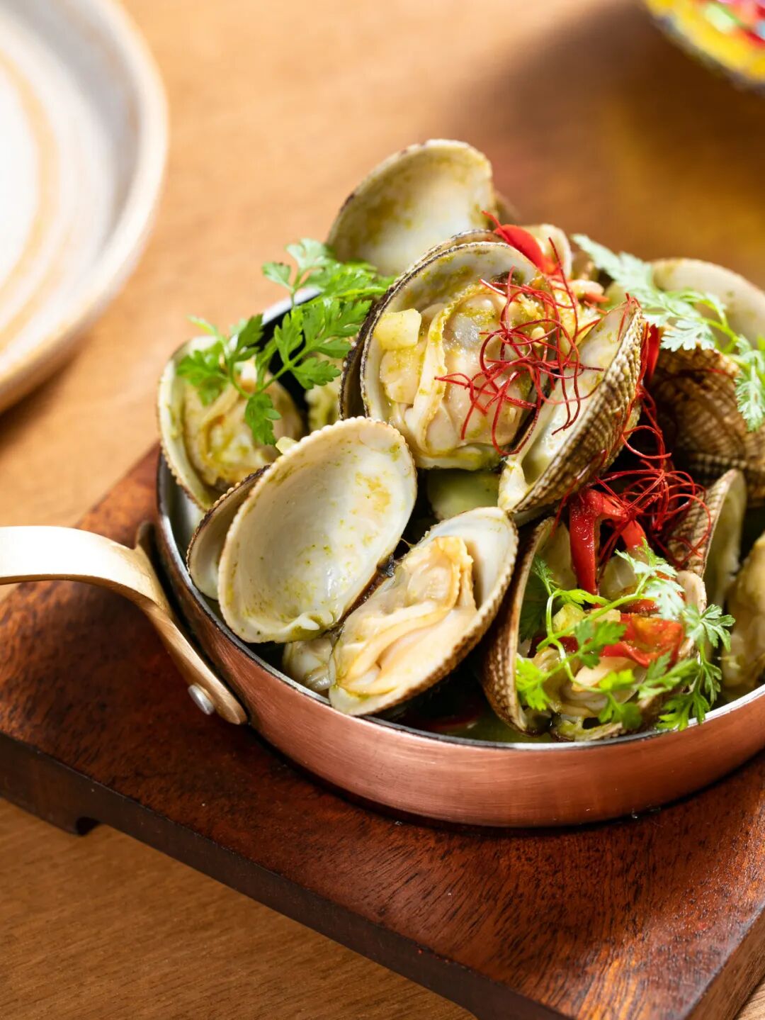 同样下酒的还有这道辣炒蛤蜊,以罗勒、辣椒等近10种香料制作的香料酱,再加上提前用葡萄酒腌制,让每一份蛤蜊肉都有着醇厚的鲜香。