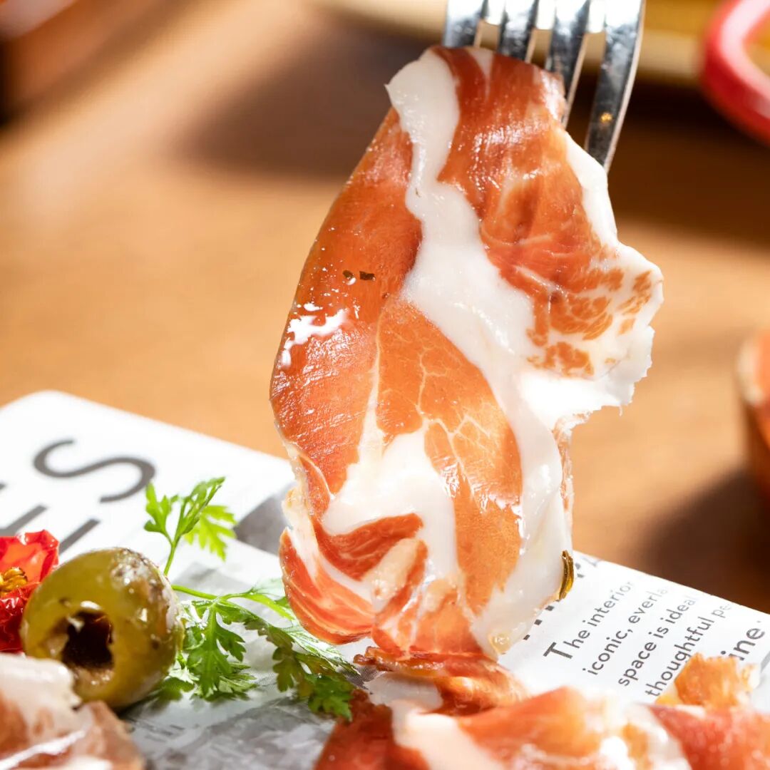 当然,还少不了西班牙人引以为傲的火腿。这里提供的,是堪称西班牙国宝级美味的5J伊比利亚火腿,这红白相间的纹路肌理,只是看着就让人心动了。