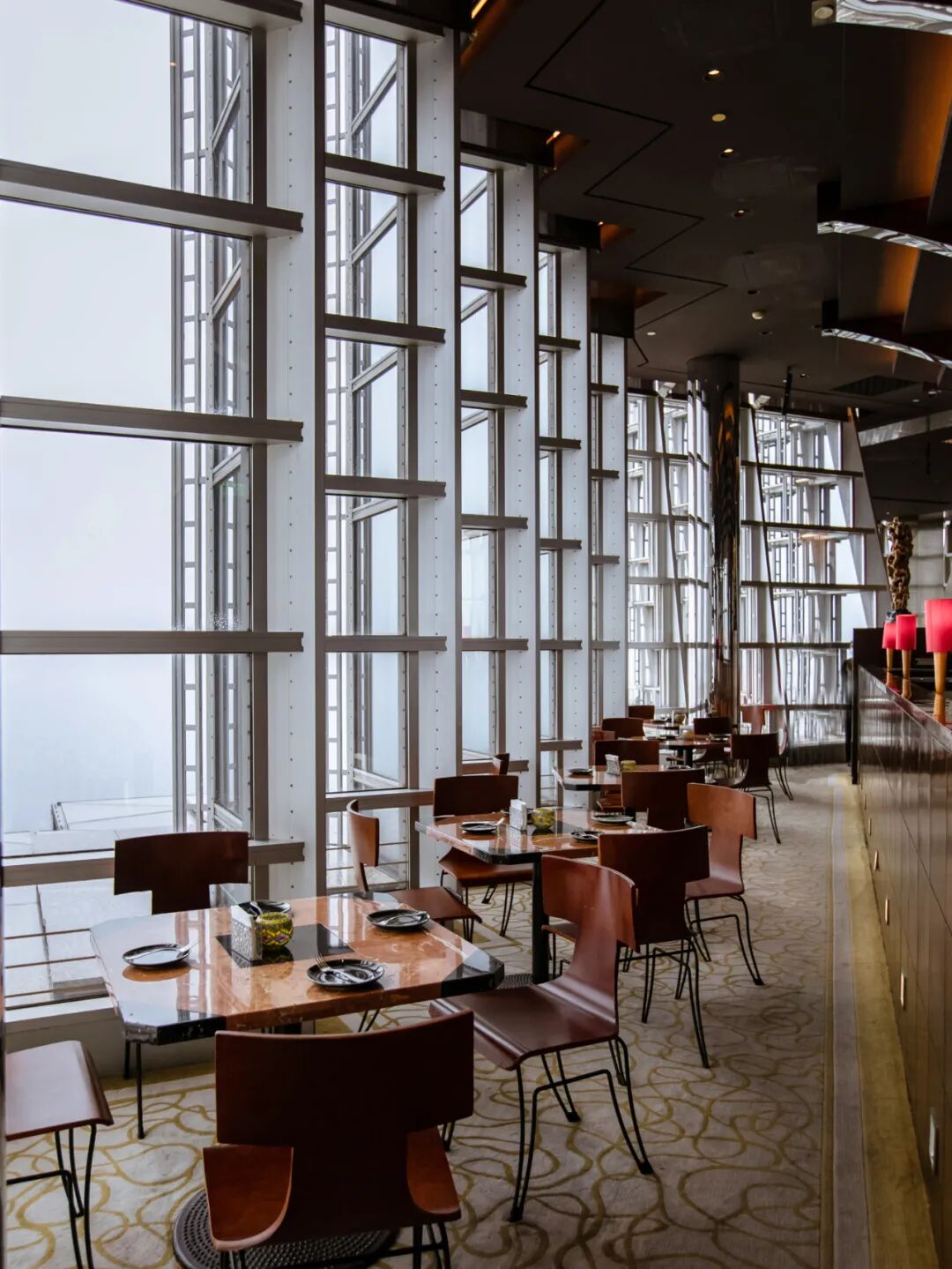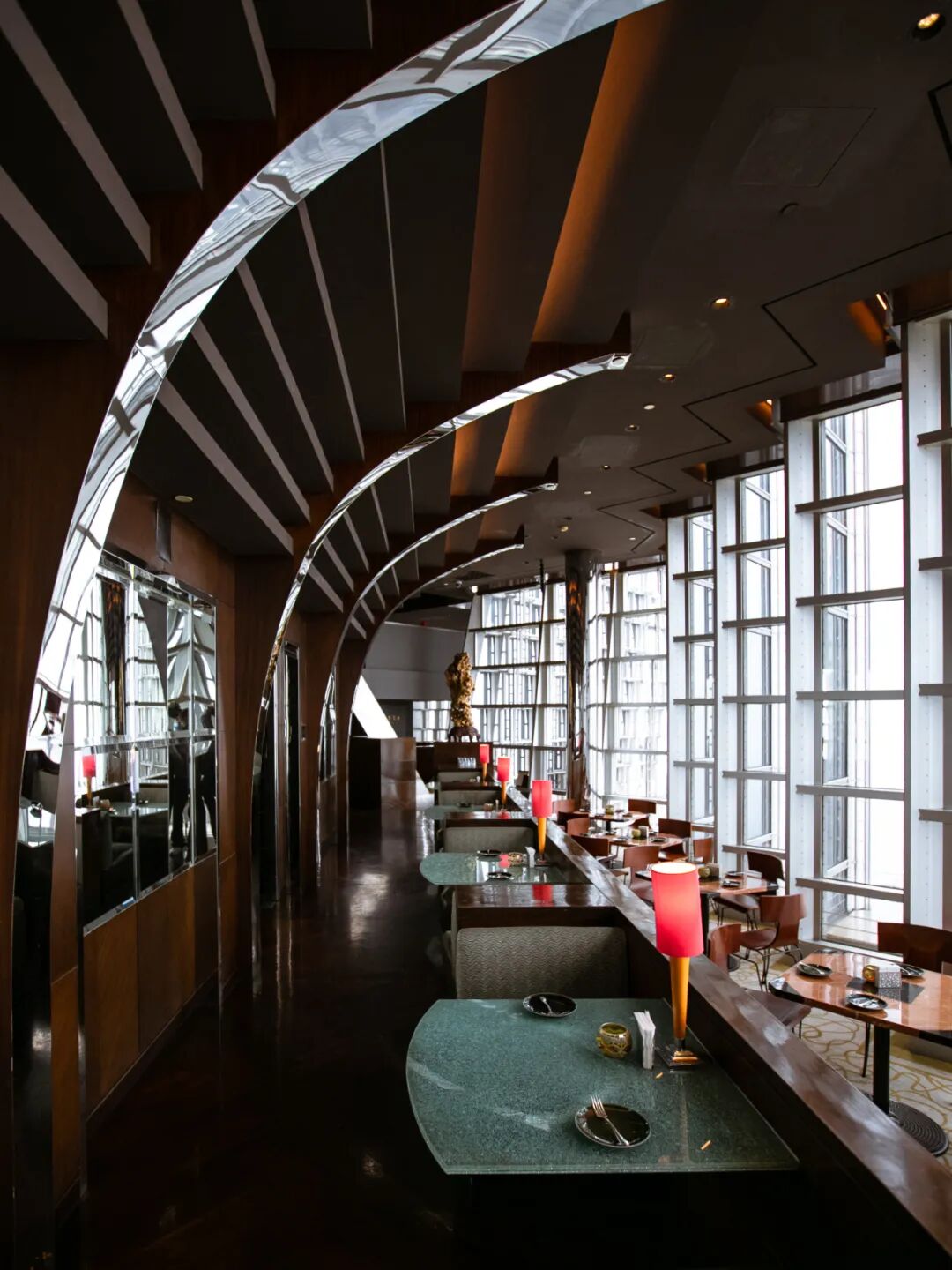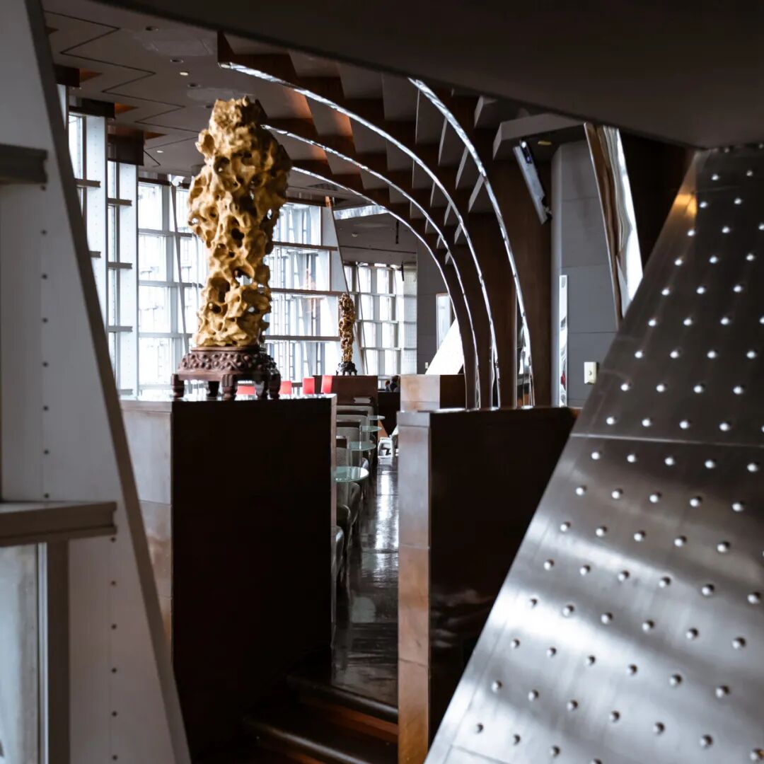 不仅如此,它的空间结构还相当奇特。因为充分利用了金茂大厦的复合三面空间和顶部的Art Deco艺术装饰皇冠,你会在这里看到各种立柱、斜撑钢梁柱和抛光镀铬镜面弧形连接。