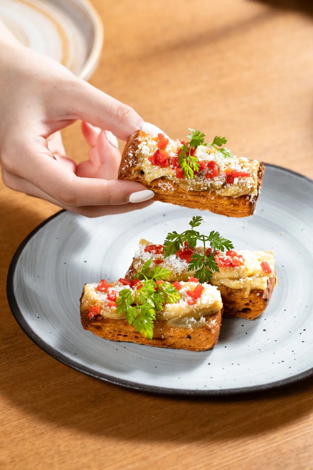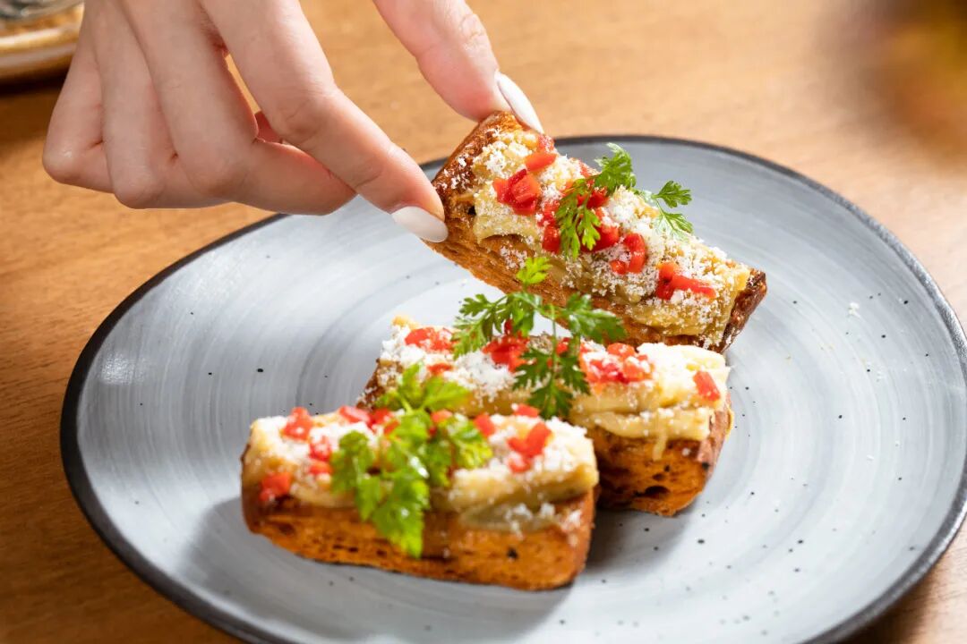 考虑到素食者的需求,主厨还特地准备了这份全素Tapas小食,和奶油芝士一同烤制的绵软茄子,搭配橄榄酱和番茄面包,吃起来也并不无趣,味道和层次都十分丰富。