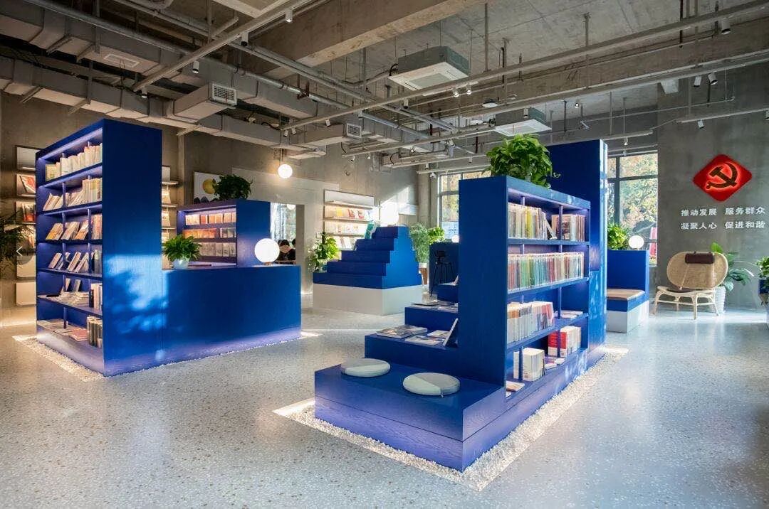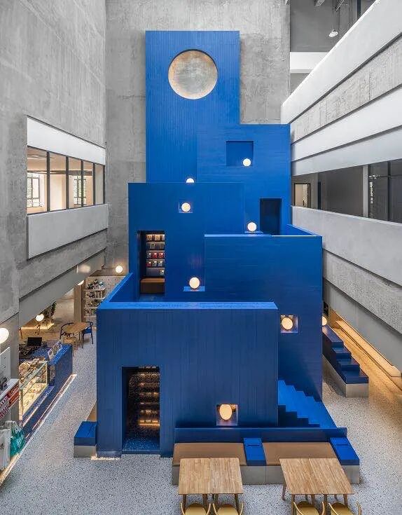 伫立在中庭的纯蓝色小山包,以中庭13米高的“明月山”为主峰,19座蓝色山岛环绕在周围,到处都藏着阅读小角落,好看到让人忍不住连续按下快门。