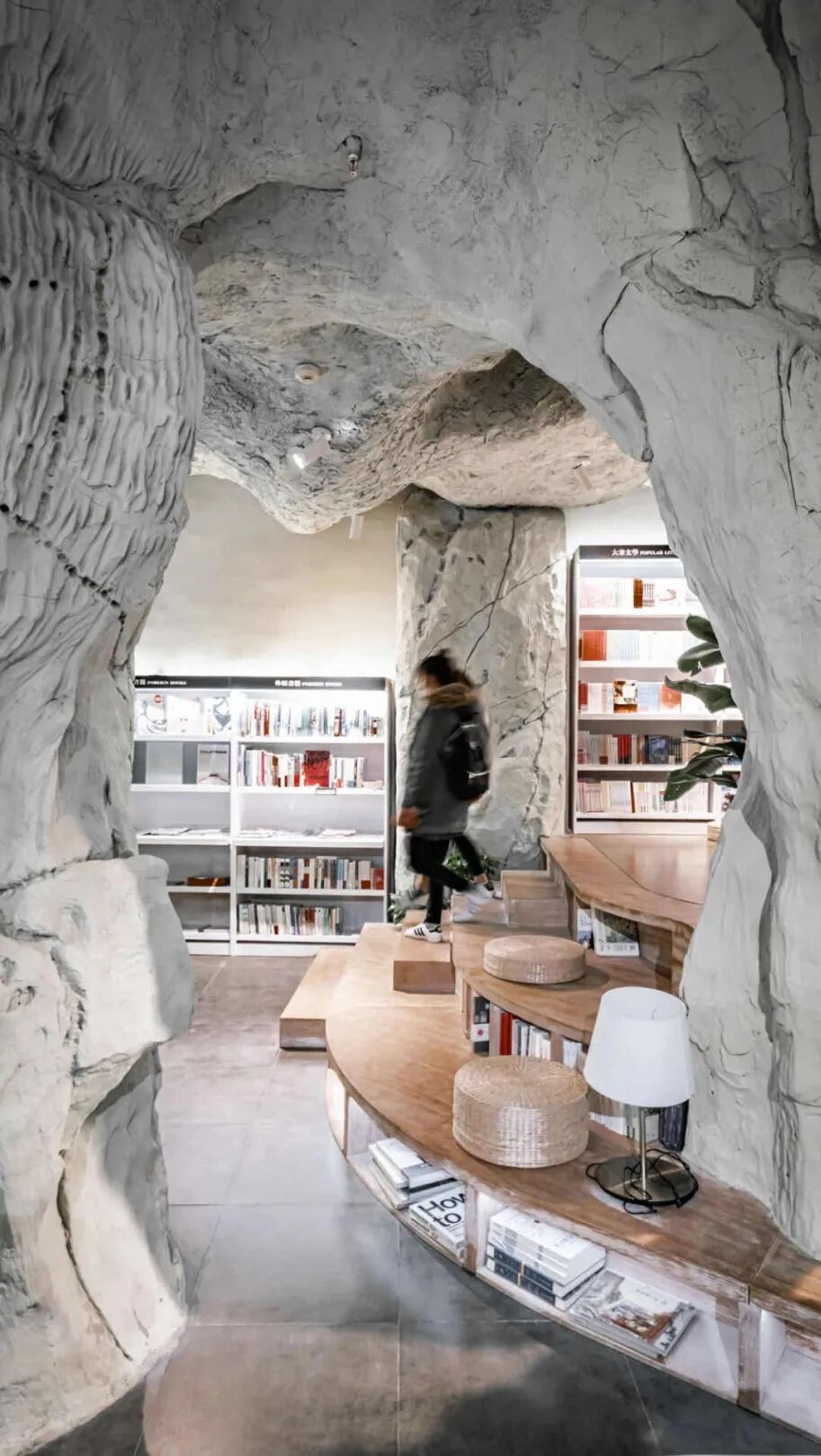 书店在洞穴各处精心布置了免费阅读区,多人长桌、阶梯式座位随处可见,营造了浓厚的阅读氛围,是商场中不可多得的静谧角落。