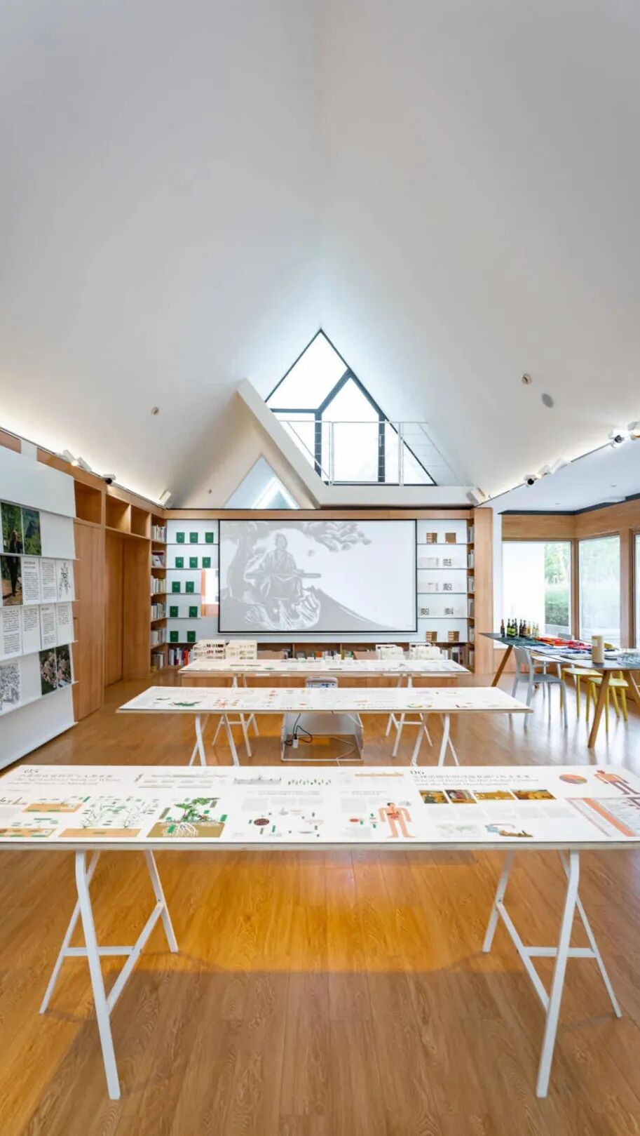 步入其中,三角形的屋顶设计很是吸睛,挑高楼层带来极为开阔的视野,虽然整体空间不大,但一点儿都不会觉得拥挤。而且,书店拥有一整面落地窗,直面户外公园绿地,无疑是个静静读书的好去处。