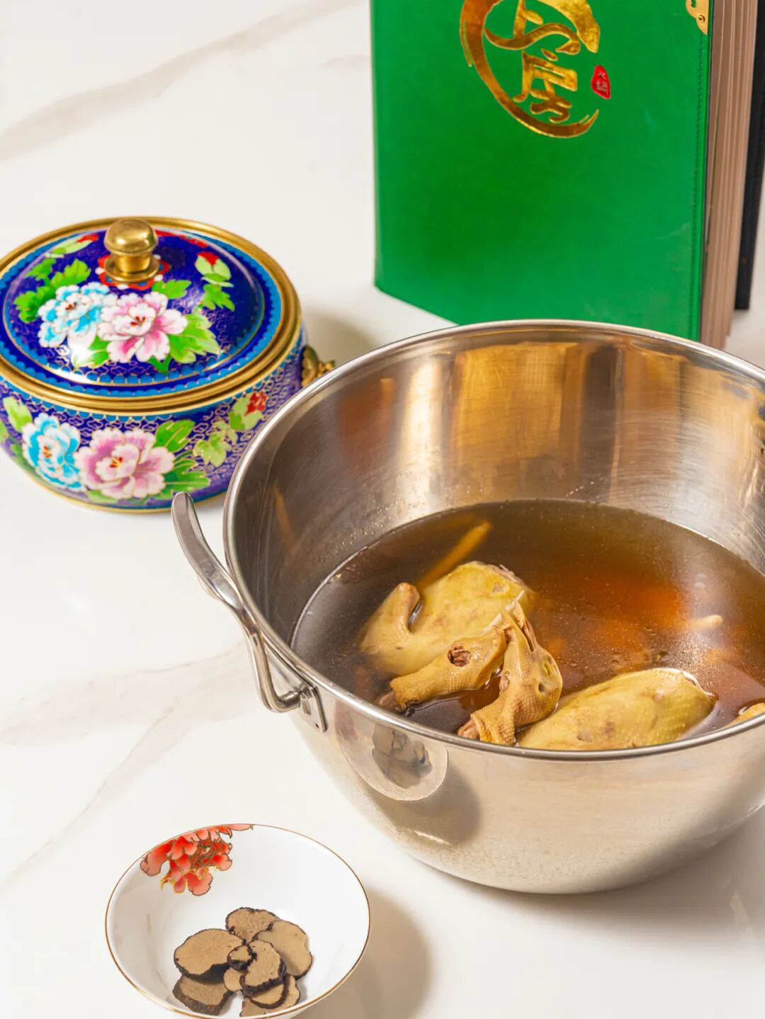 汤底精选选用7年以上的老鸽,加入梅心肉、老母鸡炖煮,足足炖够6小时上桌。服务生在桌边放入意大利黑松露,煮开后黑松露香气混合着高汤升腾而上,盛一碗品尝,清甜与醇香融为一体。