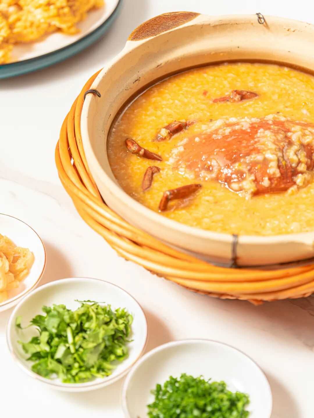 揭盖而起,夺目的蟹膏散落在米粒间,放入小油条、香葱及香菜,粥体金黄油亮,口感丰满,蟹肉慰藉了深夜的舌尖和胃。