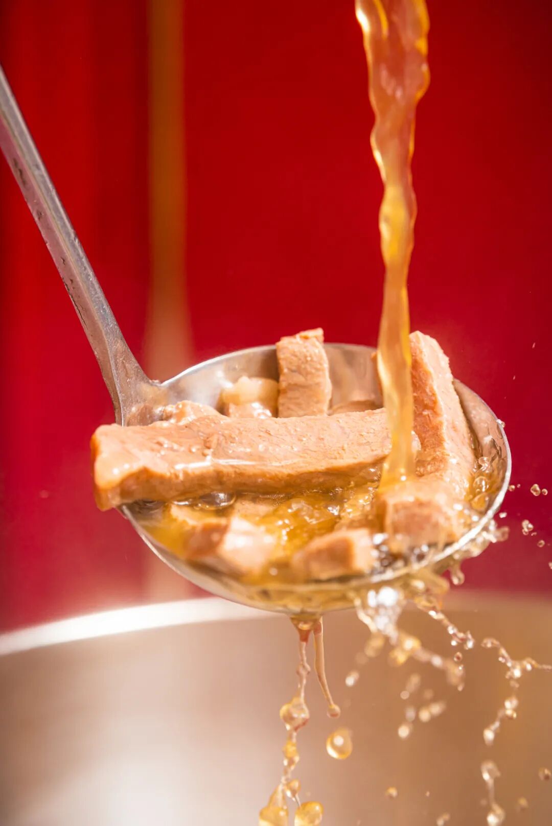 壕奢地用法国露杰鹅肝涮火锅,微微涮烫十几秒即可,鹅肝吸饱汤汁,入口甚至有爆汁感,又嫩又滑,把汤底的鲜美一揽入怀。