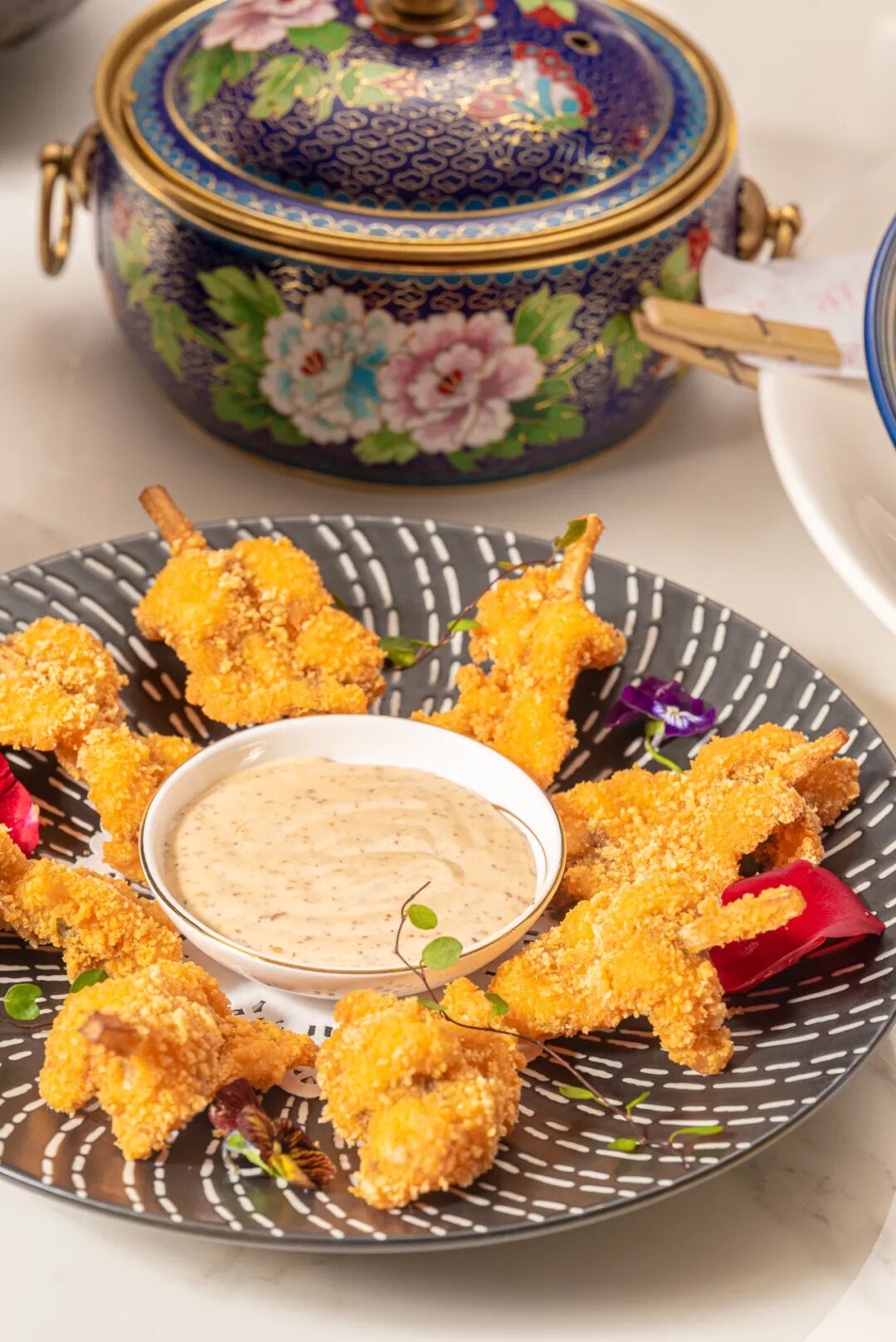 千岛黄金炸鳝,鲜活河鳗切片包裹甘蔗,裹蛋黄炸制,焦脆的外壳中是细嫩的河鳗肉,还能尝到微微的甘蔗清甜。值得一提的还有上房自制的千岛酱,主厨利用10余种色拉按秘密配方调制,恰到好处地中和了炸制的油腻,香味四溢。