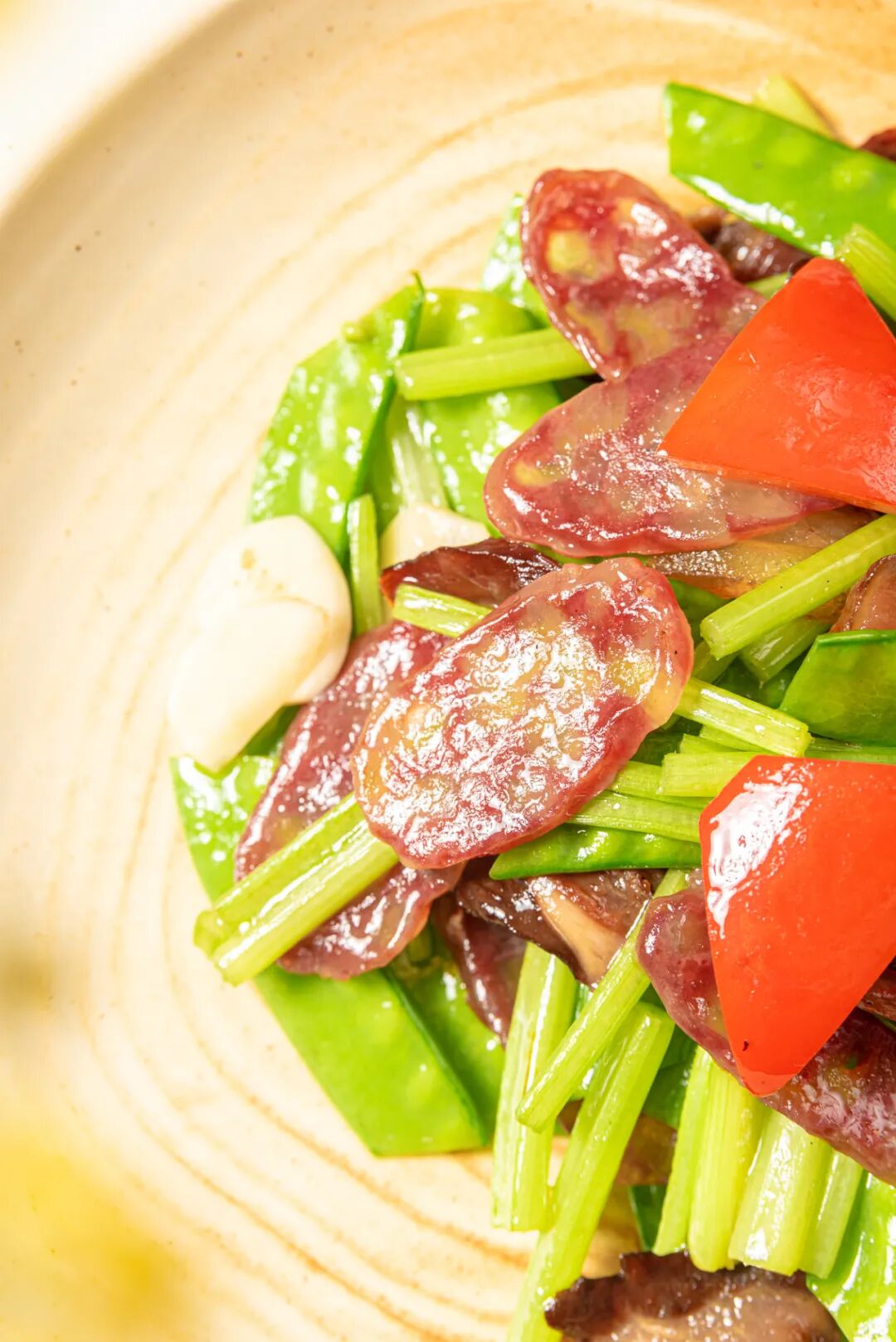 6头竹笙皇以XO酱爆,甚至还能尝到满黄满膏,咸鲜口感在舌尖升级;同样清淡家常的荷芹炒腊味,深夜品尝起来,完全没有任何负担。