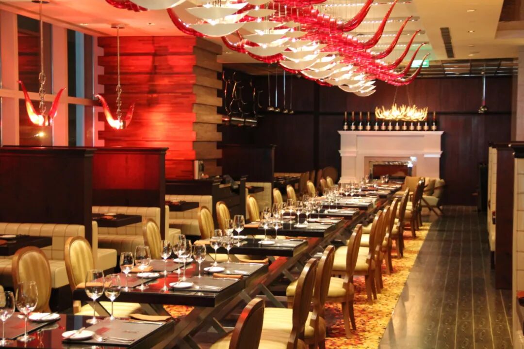 The MEAT∙扒餐厅藏在上海浦东嘉里大酒店内,原木色调的装修,简单大气,特别的牛角灯设计,和餐厅擅长的牛排料理交相辉映。