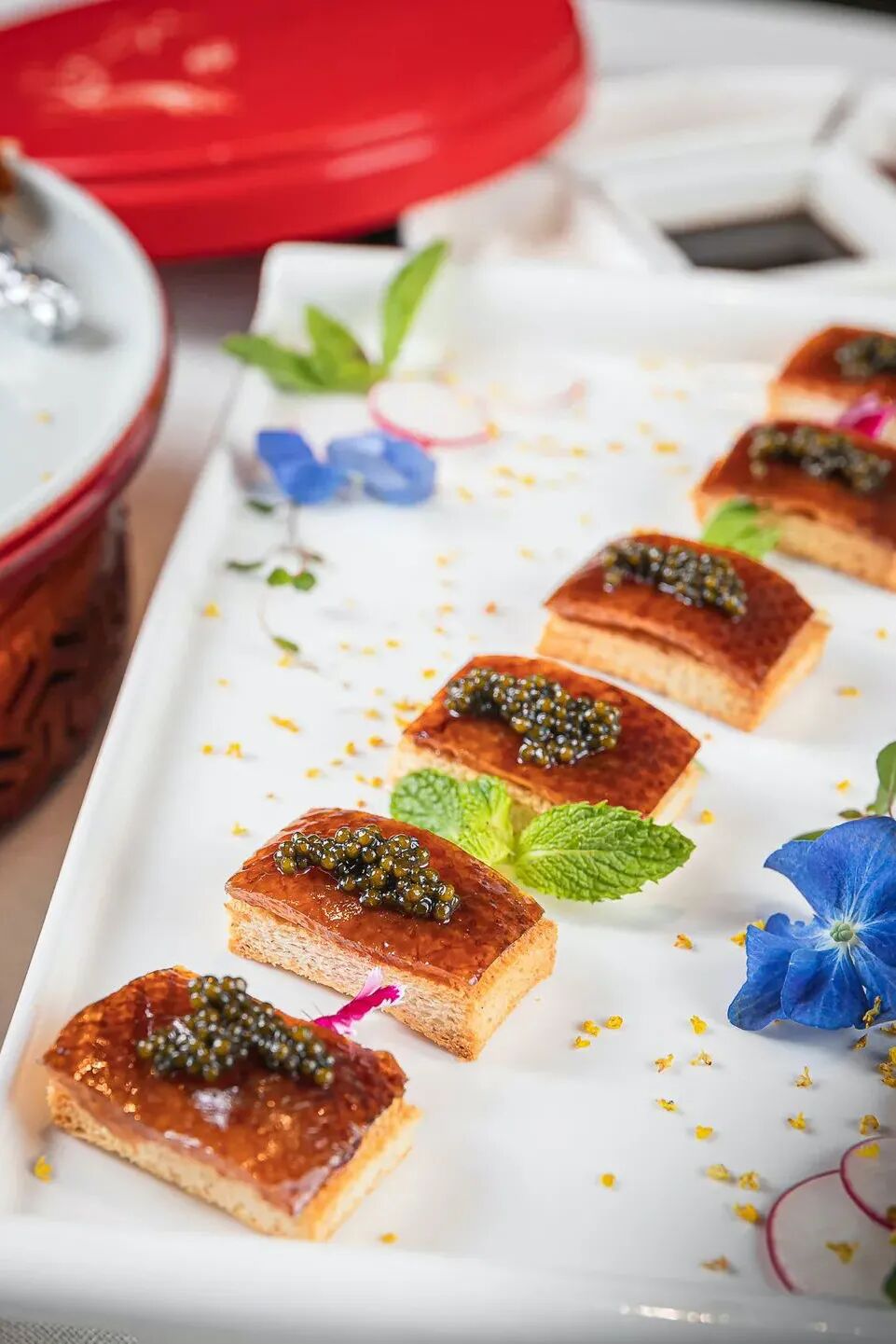 东方融宴的“融合”二字展现的淋漓尽致,特别邀请到日本料理之神小山裕久和中国名厨俞斌四手联弹,把江南创意菜玩出许多新花样。精品烤鸭和鲍鱼红烧肉是必点项,其余的如黑松露小笼包、芝麻牛肉拉皮、红枣燕窝冰淇淋都给人许多惊喜~