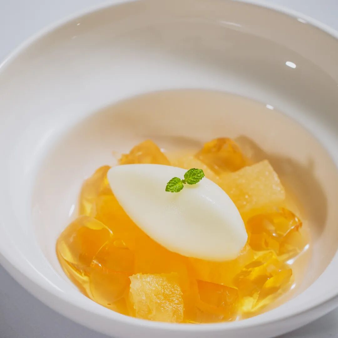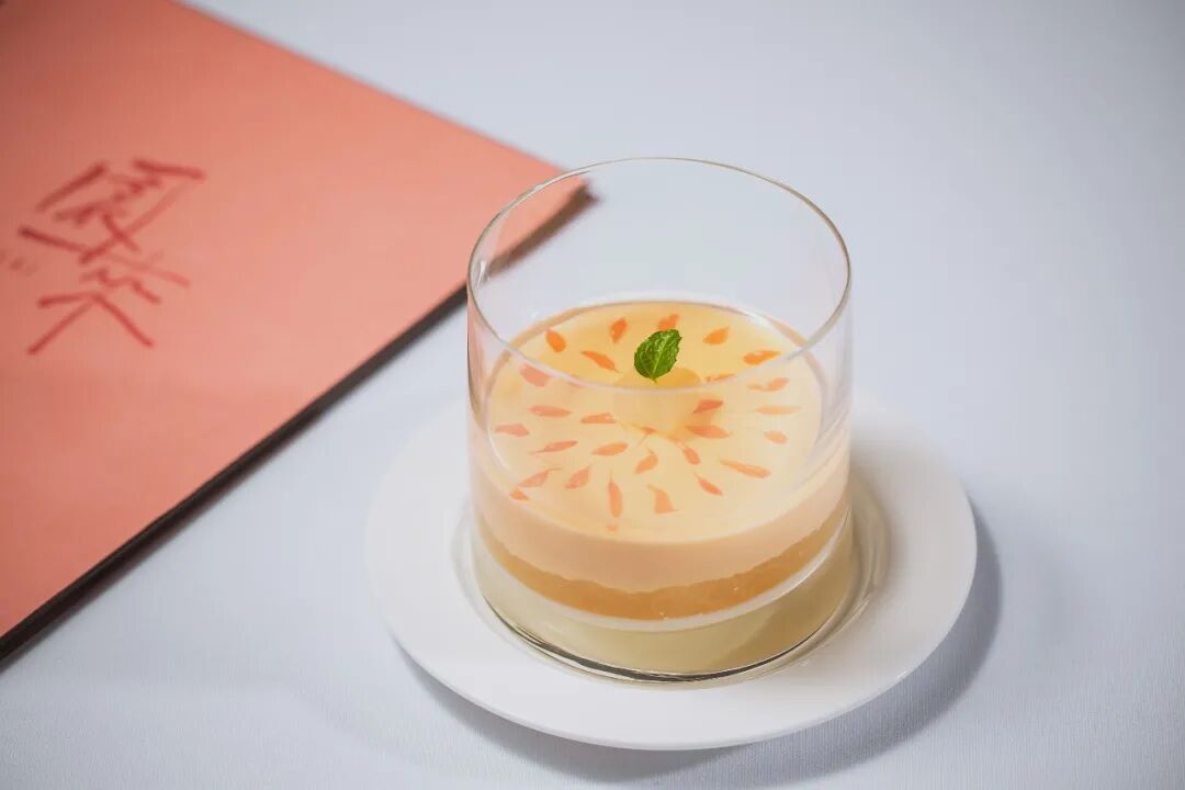 浸润了橙子糖水的柚皮,搭配啫喱与酸奶冰霜,裹挟着清香与甜美,在舌尖划下朵朵涟漪,又荡漾至心底。