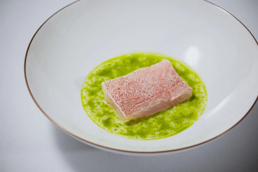 低温慢煮20分钟的东星斑,鲜度得以最大程度被保留,浸润在代表春季味道的荠菜油鱼汤里,滋味加倍鲜美。
