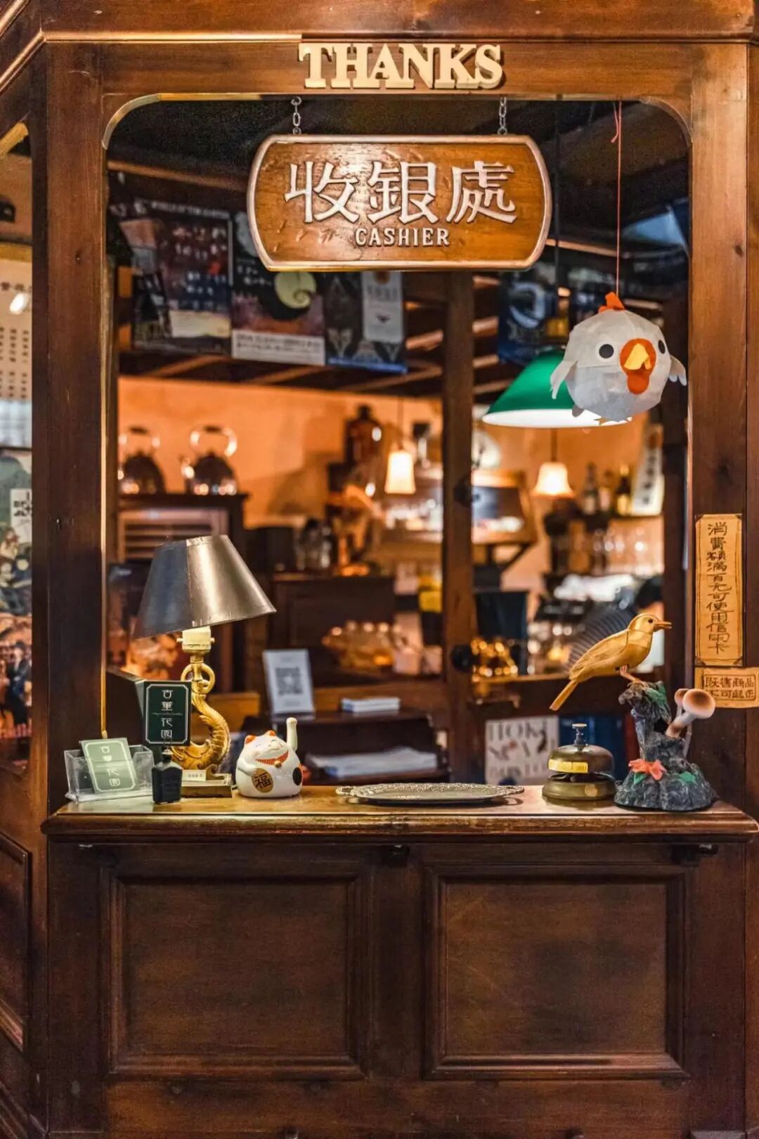 推门而入,老洋房一楼的昏暗灯光瞬间把你拉入了复古温暖的氛围,老式收银台、旧杂志、酒杯、玩具、钢琴谱等老古董都有自己的位置,仿佛在诉说着动人的故事。围着它们溜达一圈,甚至有种坠入了宫崎骏动漫《猫的报恩》里面猫男爵的古董店的错觉。