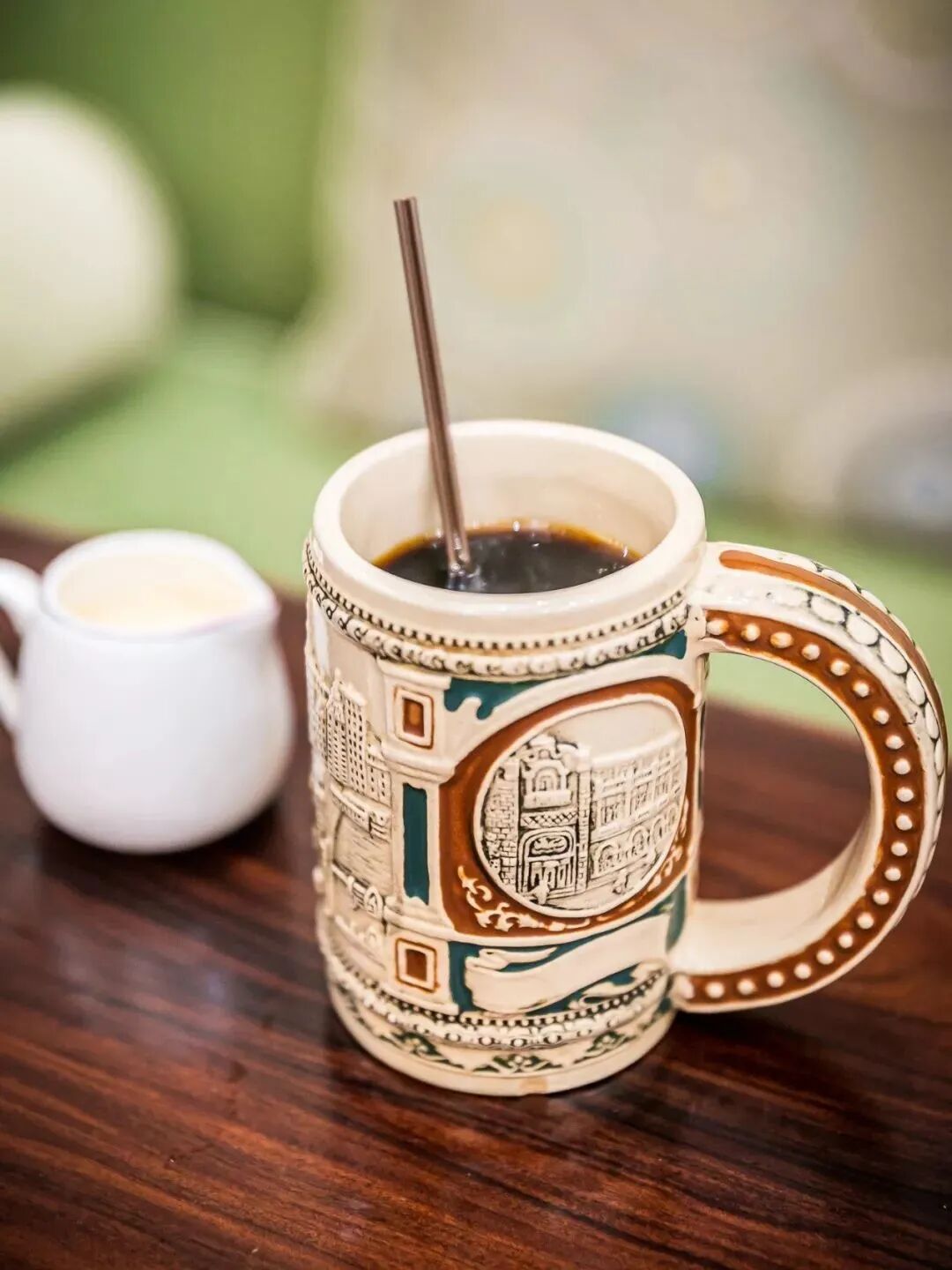 内部保留有原来的民国风格,陈列的都是上了年纪的老物件,让人见了就有种掉进岁月里的恍惚感~绿墙、红色皮质沙发、做成行李箱风格的茶几桌,每个地方都能拍出一张老上海风情照。