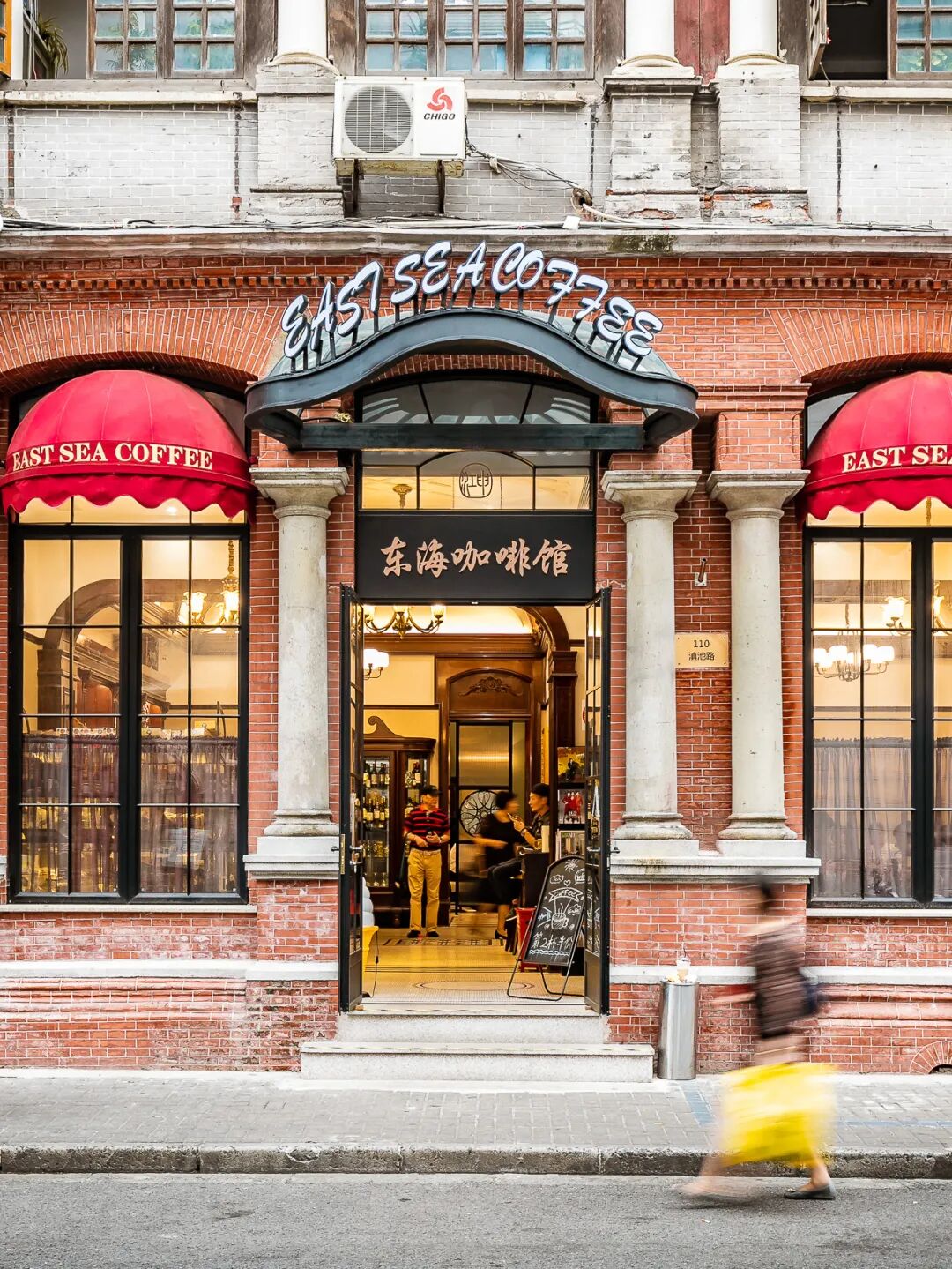 如今这座高龄咖啡馆仍然矗立在滇池路上,外部建筑是一座比它本身还要再古老的西式洋楼。红色清水砖墙、罗马立柱、拱形玻璃落地窗、红色雨搭与东海咖啡馆颇有海派气质的门头很是搭配。不时有来往爷叔阿姨驻足拍照,或许,是在回忆自己的青葱岁月~