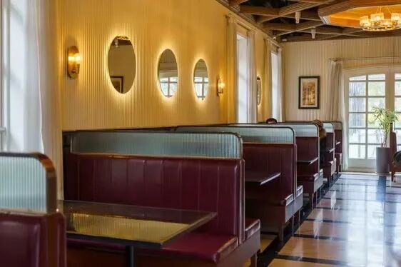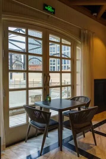 内部环境比其他门店更宽敞些,酒红色沙发卡座,复古天花板、大理石砖,无一不流露出复古气质,圆圆的镜面更是让人产生了在船舱内的错觉~如果坐在庭院里,则可以将不远处的外白渡桥和上海大厦风光尽收眼底,堪称一线江景座位!