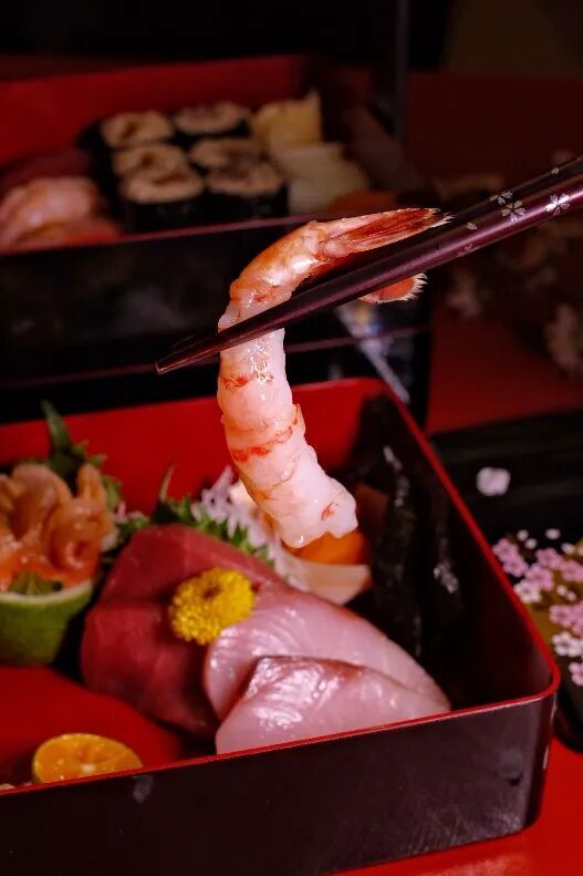 3层便当盒里分别是刺身、寿司和酉前,每天的鱼货都有调整,具体可以询问餐厅。是日便当惊喜满满,第一层的刺身就包含北海道牡丹虾、长崎赤贝、岛根金枪鱼大腹、青森魳鱼、根室海胆。