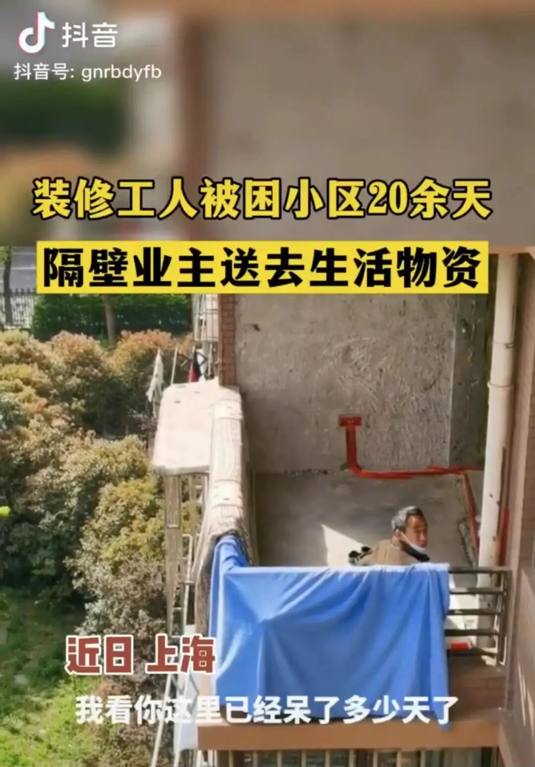上海某一小区的装修工人被困20多天,虽有基本物资,但细心的邻居发现后,也尽力给予工人缺少的物资。