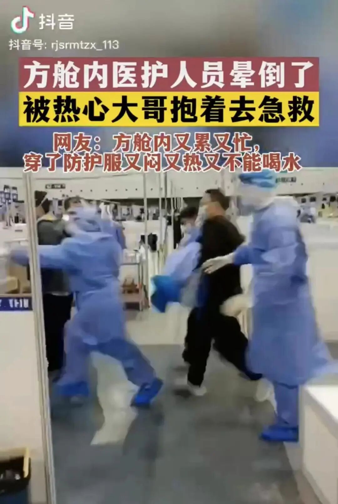 方舱内忙碌的大白,穿着又闷又热的防护服里不能喝水,转轴工作晕倒后,热心大哥毫不犹豫抱起大白去急救。