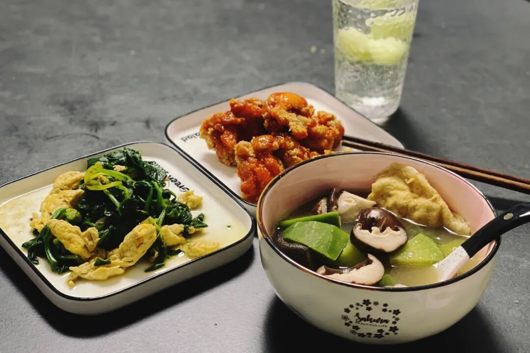 以前上海家里从不开火,水煮蛋是我日常对自己的最高礼遇,第一个礼拜基本靠鸡蛋、牛奶、面包存活下来,后来渐渐升级到水煮菜和煲汤,这几天有点膨胀,动起了油锅,感觉厨房要炸了,我爸爸安慰我说,熟了就行。