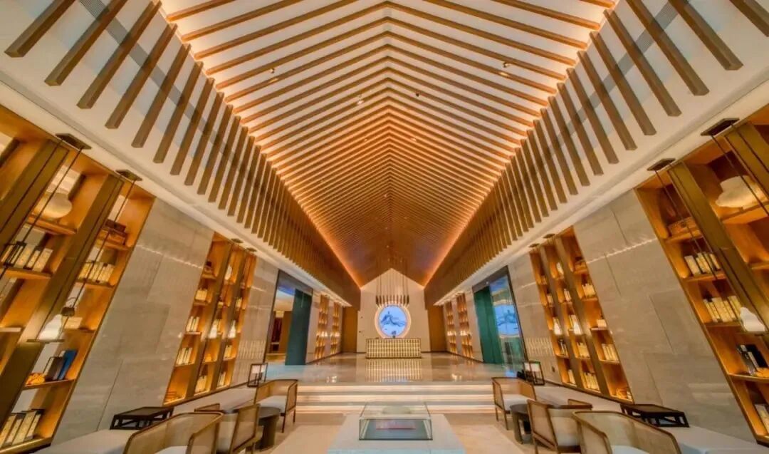 大堂的中式设计典雅大气,同时它也是一个书吧,名为陌上,取自汉乐府的《陌上桑》。这里的书籍,均被精心挑选,以供客人阅读。