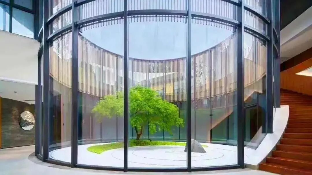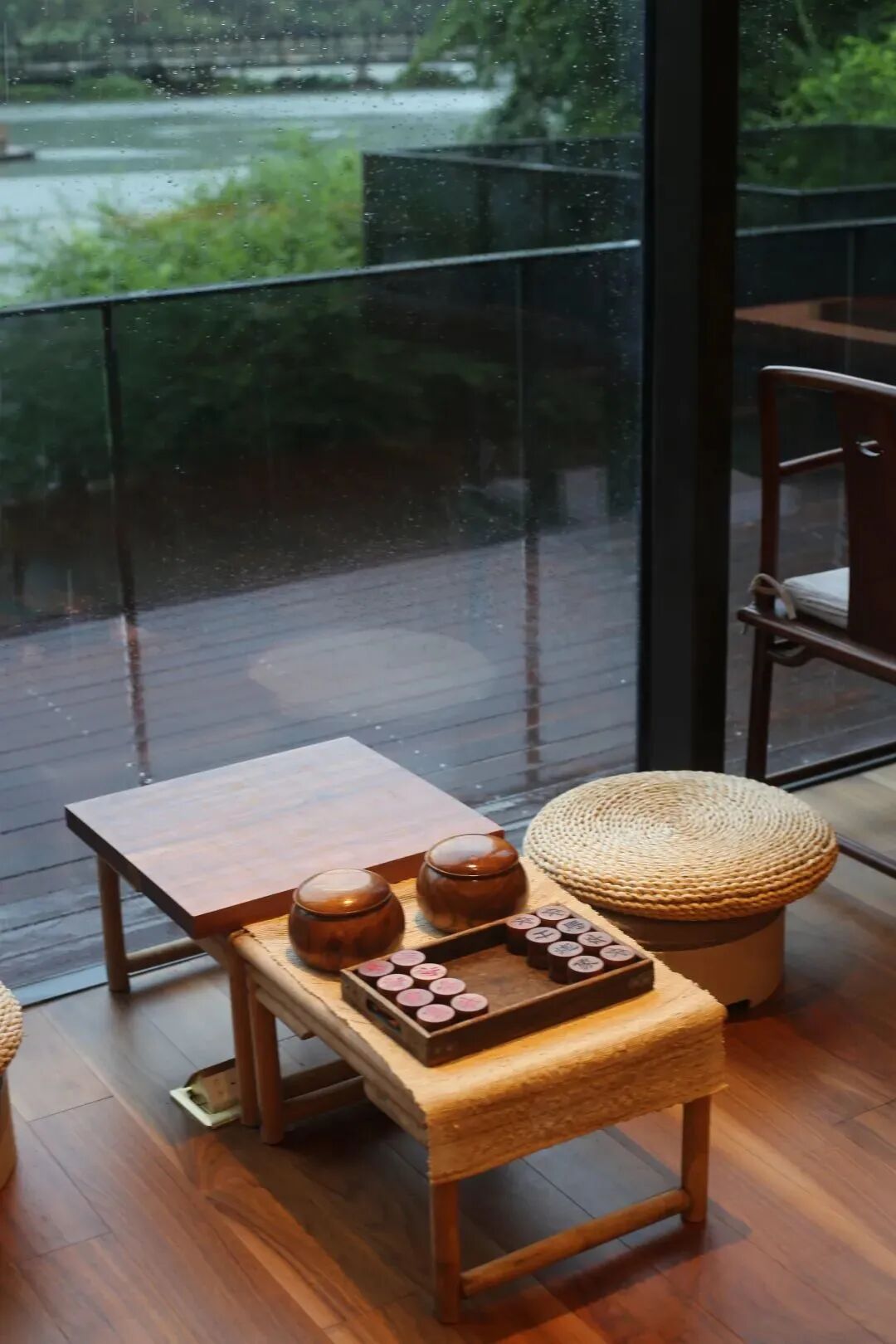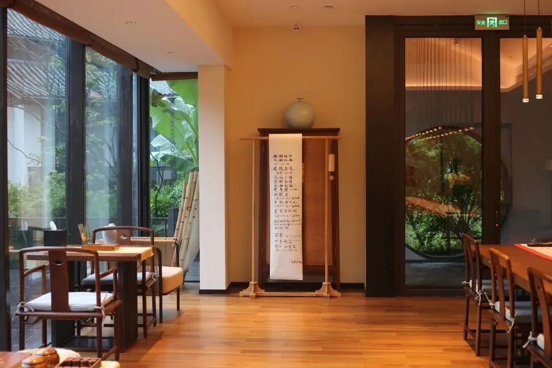最让我眼前一亮的便是面向户外的落地窗景,满目葱绿都被呈现在眼前。中式的桌台上放着艺术品,坐在地垫上读书品茶,旁边便是观景鱼池,禅意十足。