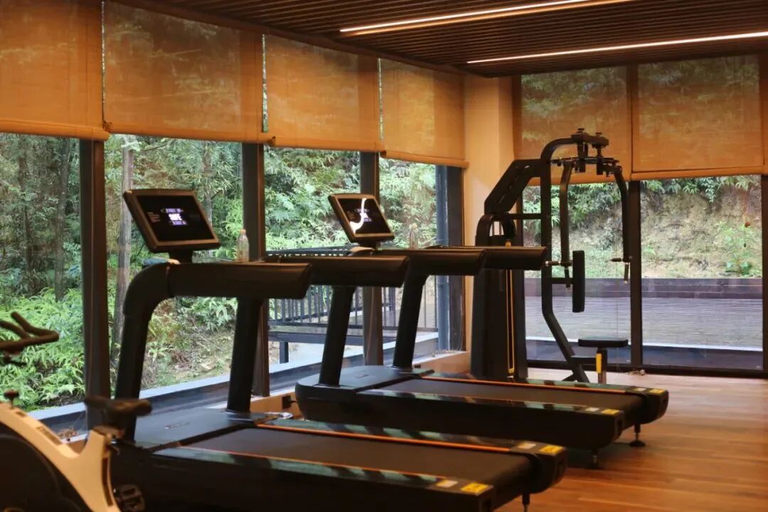 健身房的设施虽少但精,器材十分高端。门外还有一片练习瑜伽的区域,清晨在山林间锻炼身体,好好享受这个天然氧吧。