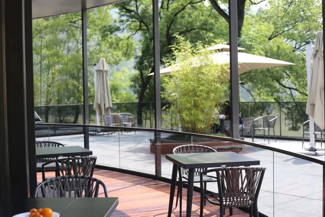 室外露台直面富春江,午后与好友坐在这里品茗小聊,静静地听风声雨声,或是沐浴阳光,实在是享受。