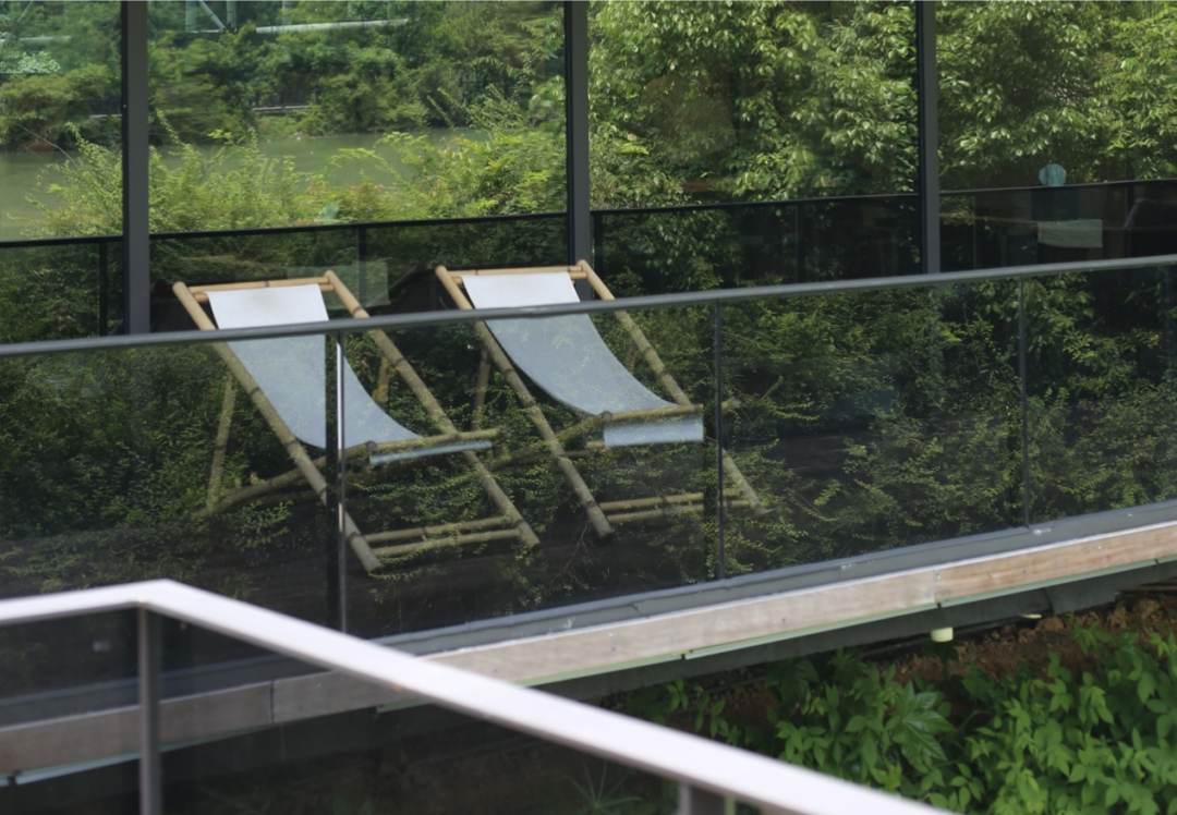 面向竹海的无边泳池独具设计感,池边还有度假椅。在林间与山水同游,好生舒适。