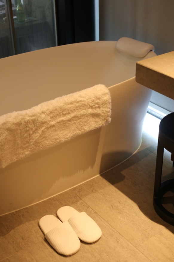 浴袍非常舒适,棉质很柔软。拖鞋经过底部加厚,踩上去后十分柔软。浴缸还贴心的准备了头靠的皮垫,迫不及待的准备泡澡了。