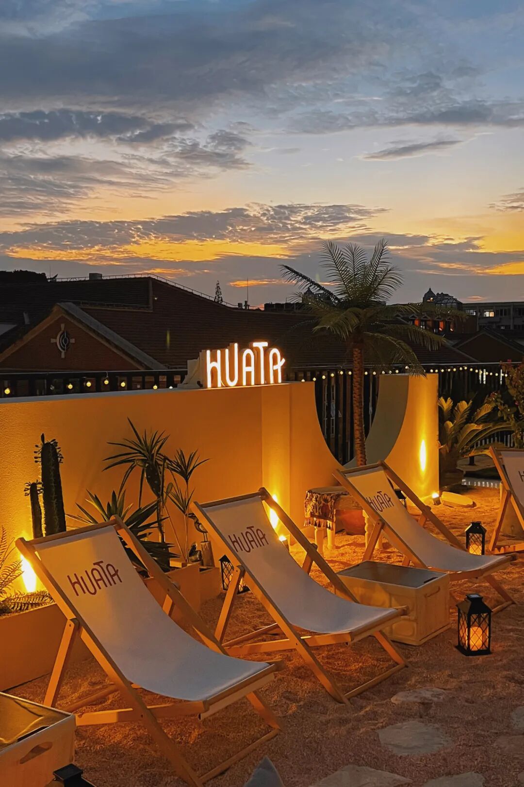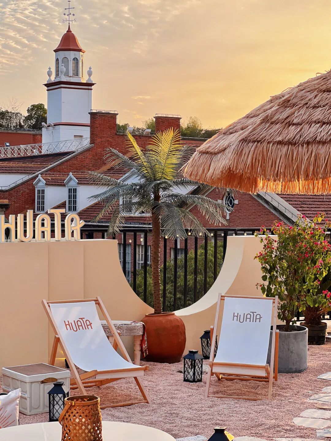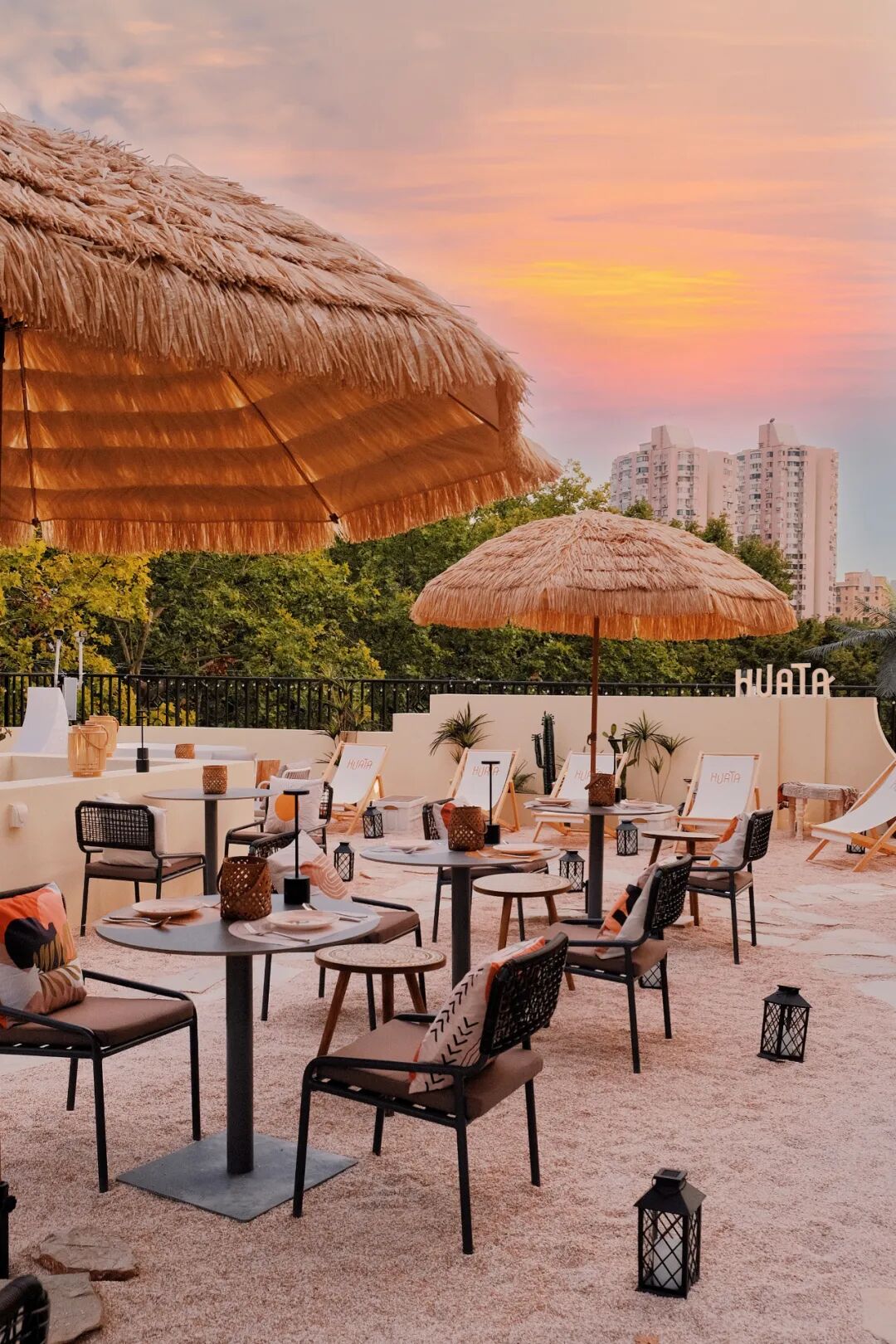 新开在衡山路的西班牙餐厅HUATA 'Holiday Plan 花榻,悄悄将一片沙滩搬进楼顶,同样是最近人气很高的露台打卡地。