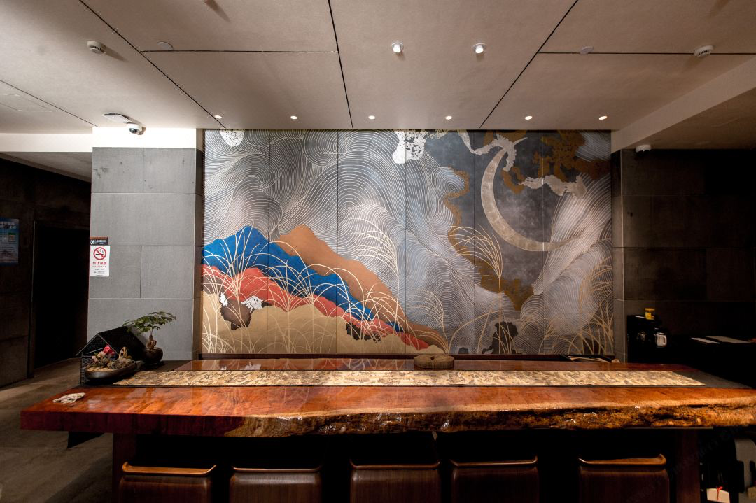 大堂前台的背景,是一副巨大的纯手工绢画,一轮弯月,照耀着世间的山水,纹理清晰的波涛,映衬着色彩分明的山体,颇有几分葛饰北斋《神奈川冲浪图》的神韵。