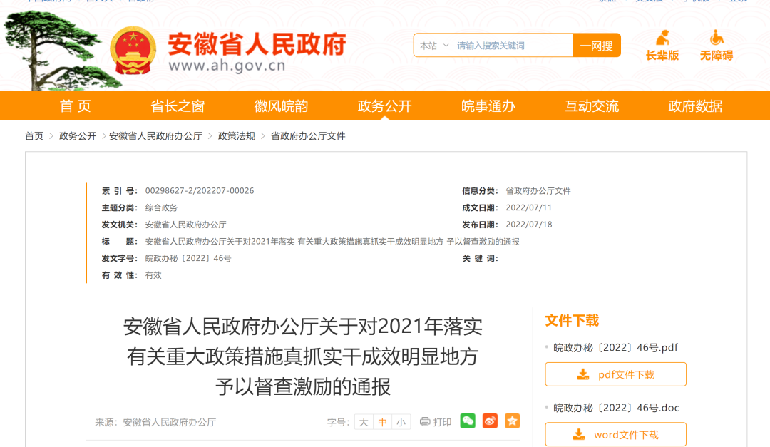 根据《安徽省人民政府办公厅关于新形势下进一步加大督查激励力度的通知》(皖政办秘〔2022〕24号)精神,经省政府同意,现对2021年落实重大政策措施真抓实干、取得明显成效的16个市、63个县(市、区)予以督查激励,相应采取39项激励支持措施。
